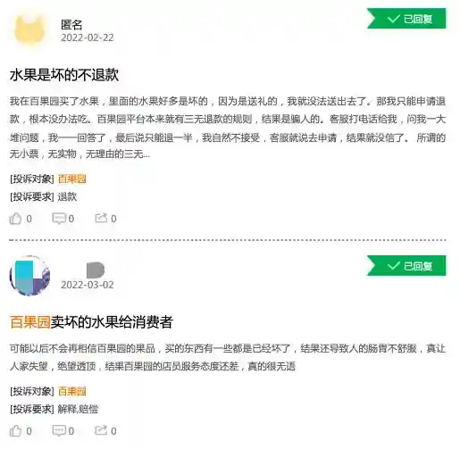 截至3月17日,黑猫投诉平台有关于百果园的投诉量多达1198条,大多都指向了“水果质量差”、“霸王条款”等。
