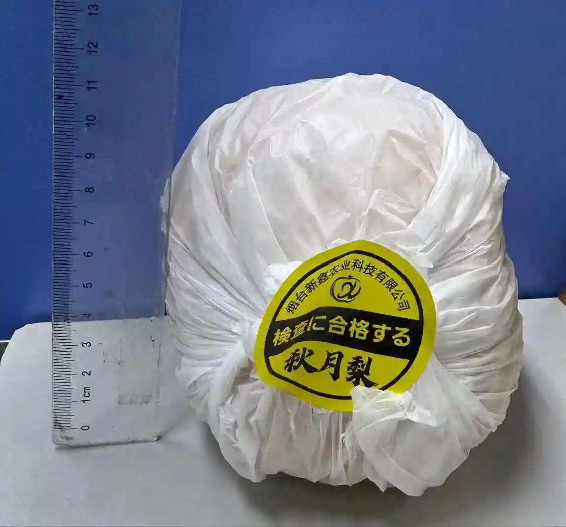 市民陈女士在该店挑了一个大规格的秋月梨,一只手只能勉强握住,花了13.8元,包装上写着“烟台新鑫农业”。她回家一量,这个秋月梨的直径达到11厘米。