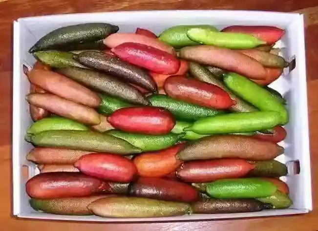 指橙:号称“水果中的鱼子酱”的神秘水果,挂在树上的时候长这样,像一根根黑化的香蕉。一旦切开,里面就像装了一肚子的鱼子酱,看上去是颗颗透明,咬下去是蜜瓜汁的味道。