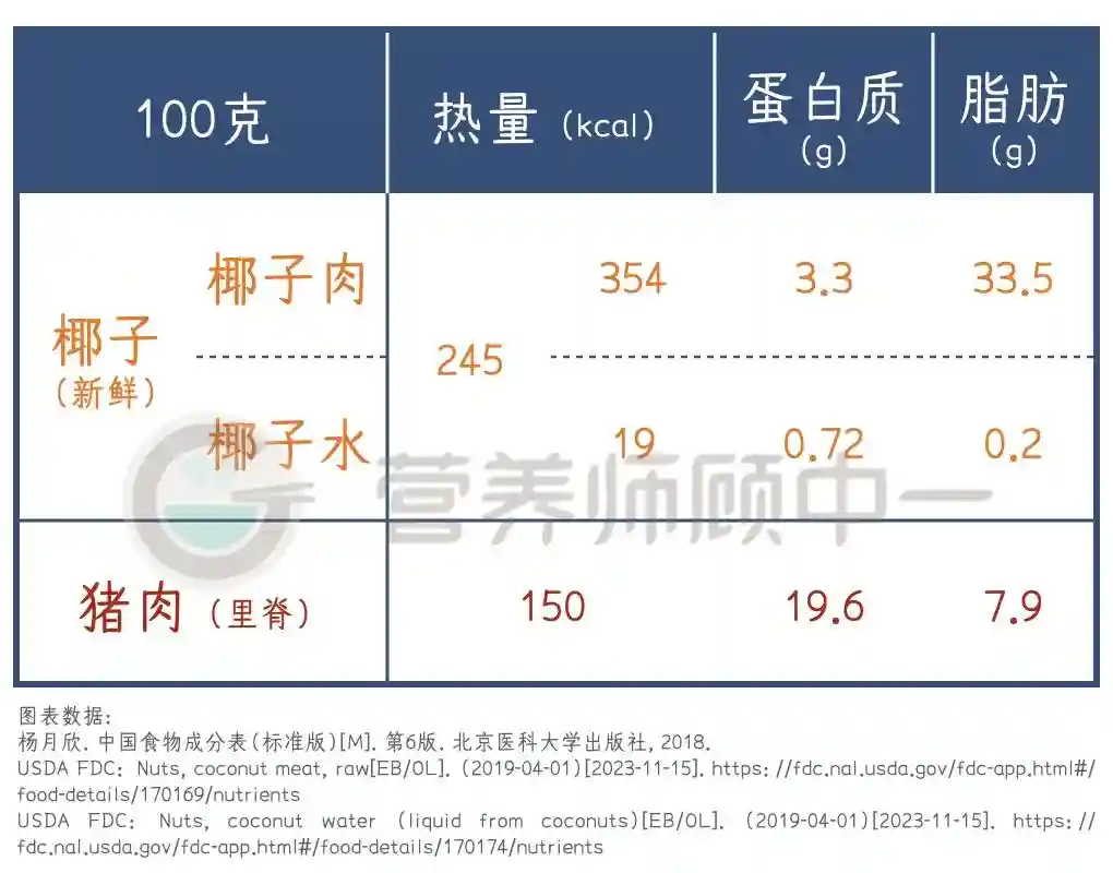 根据美国农业部的数据,100克新鲜的椰子水的热量只有18kcal,而椰子肉的热量则为354kcal,总脂质含量更是高达33.5克,其中饱和脂肪酸29.7克[1,2]。