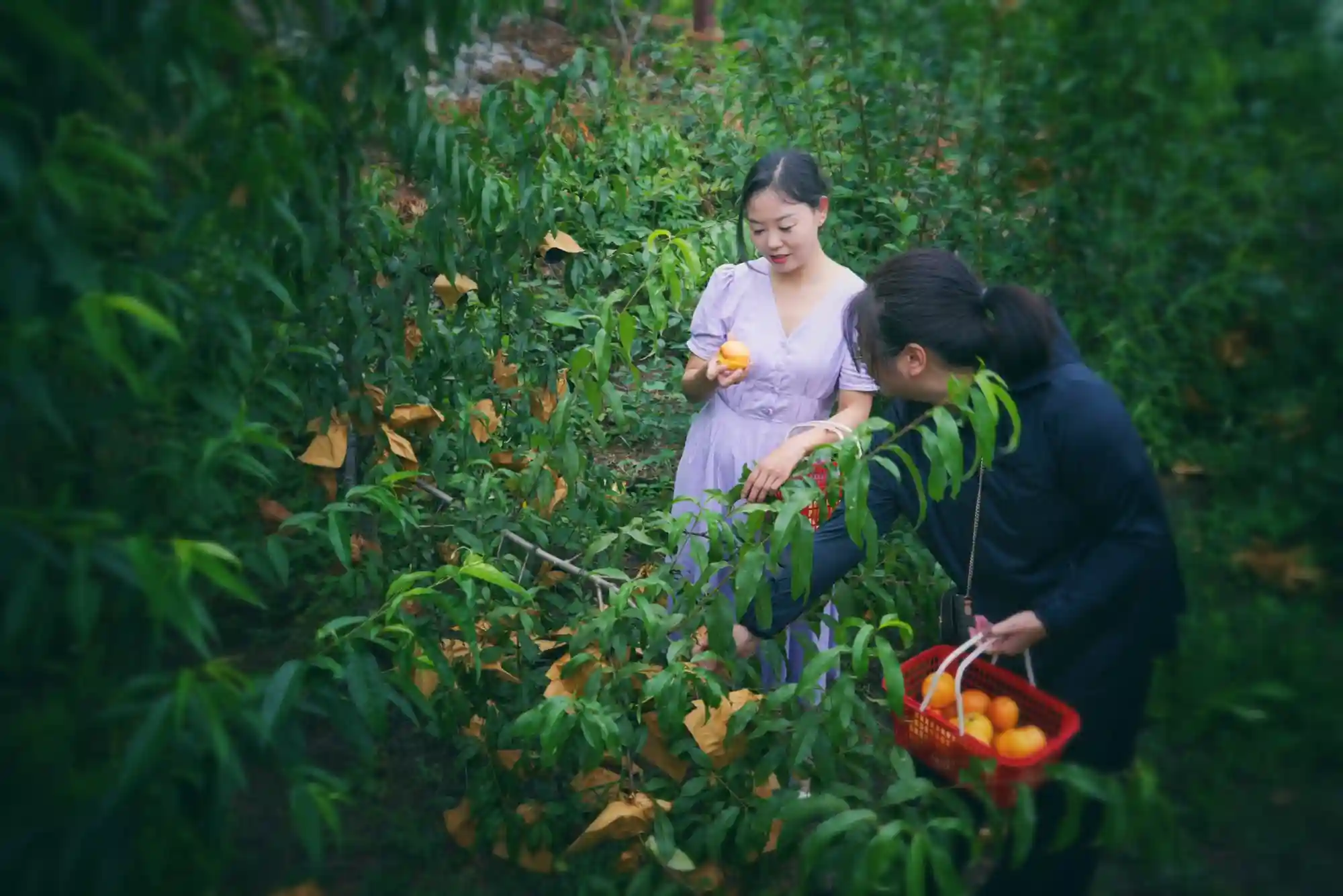 正在果园内采摘桃子的游客们(央广网记者左洋摄)