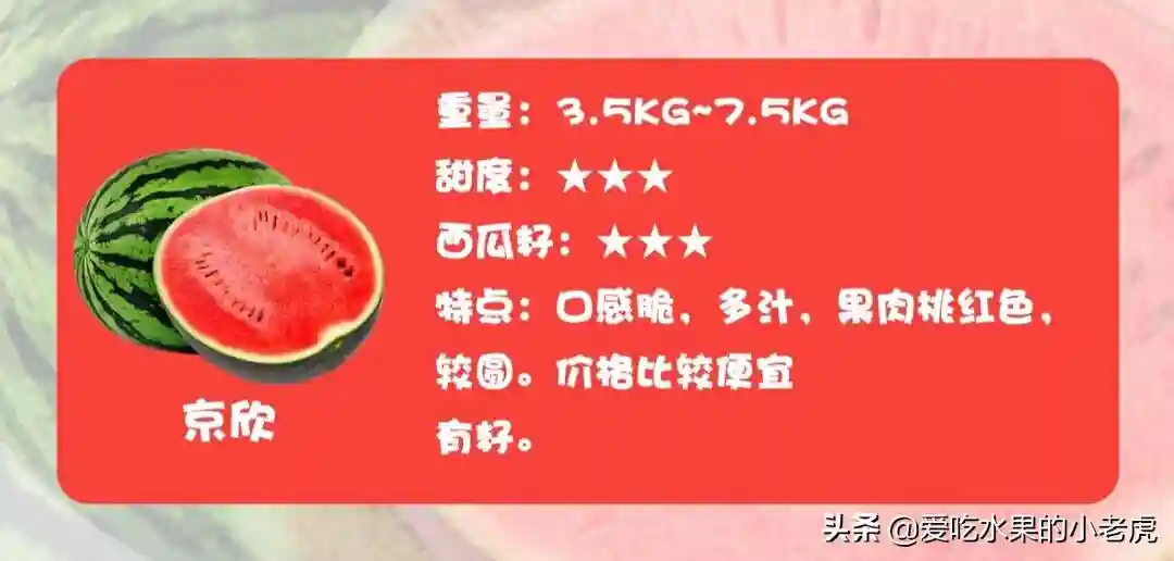 京欣西瓜瓜圆、肉厚、沙甜,个重。一般的重7至15斤,瓜皮一般的厚1.5厘米左右,是制作蜜饯的原料,用它加工而成的西瓜酱清纯甜美。