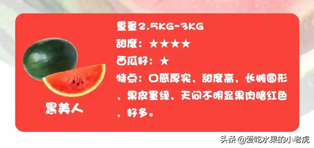 黑美人西瓜是西瓜的一个品种,黑美人西瓜比其他品种的西瓜要甜肉比其他品种的瓜要紧,价钱:瓜农那里收购一般都是在5到6毛左右。这种西瓜果实呈长椭圆形,瓜较小,果皮深黑绿色,有不明显的条纹。