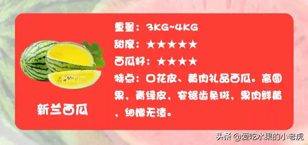 新兰西瓜花皮、黄肉礼品西瓜。高圆果,青绿皮,窄锯齿条斑,外形秀丽,果皮极薄,较耐裂,果肉鲜黄,细嫩无渣,入口即化,品质极佳,长势中庸易座果,较小兰个大耐裂。