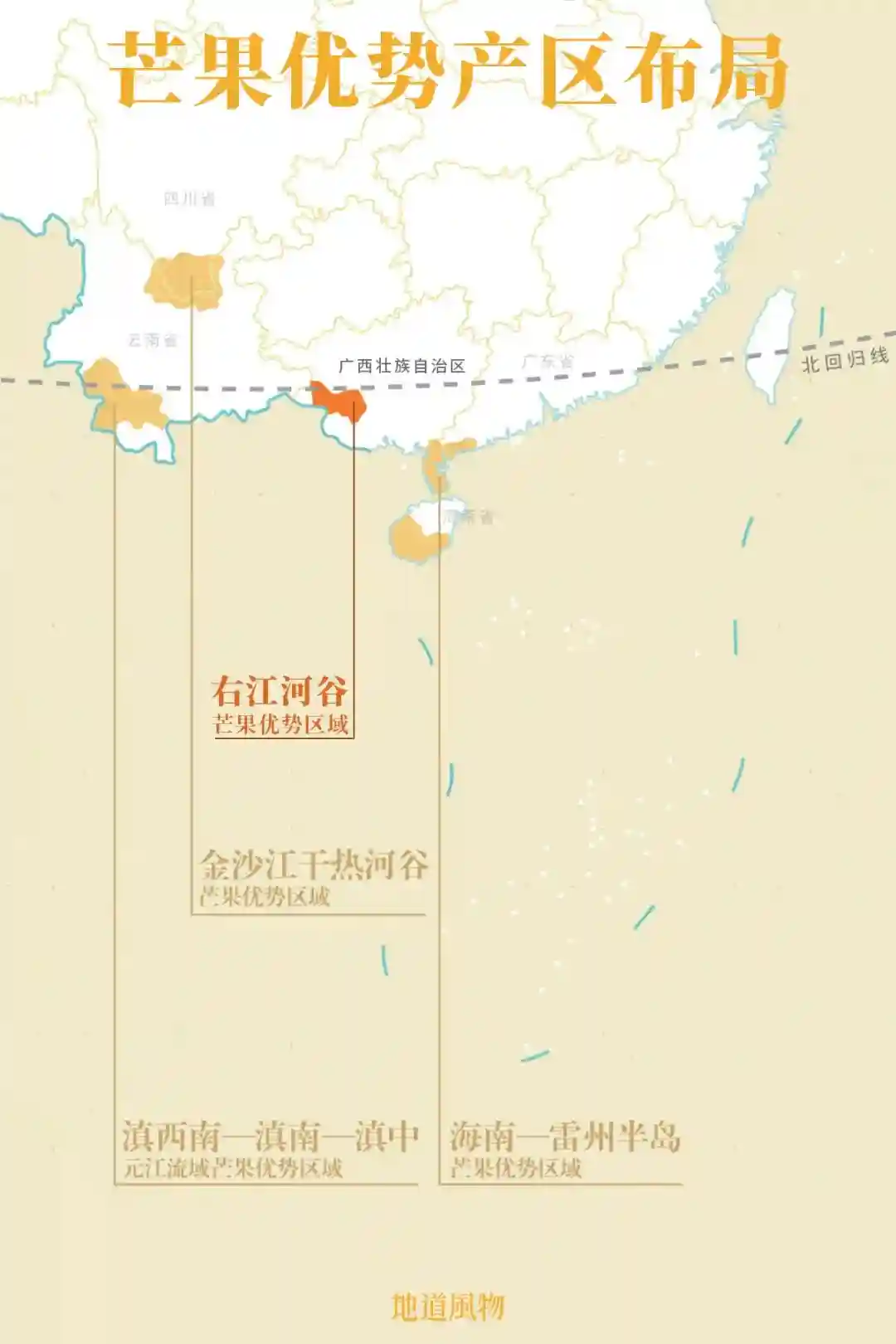 芒果是典型的喜热作物,气候条件是它在我国生长最核心的限制条件,因此,要说中国哪里的芒果最好吃,我们首先要跟着优势产区找。