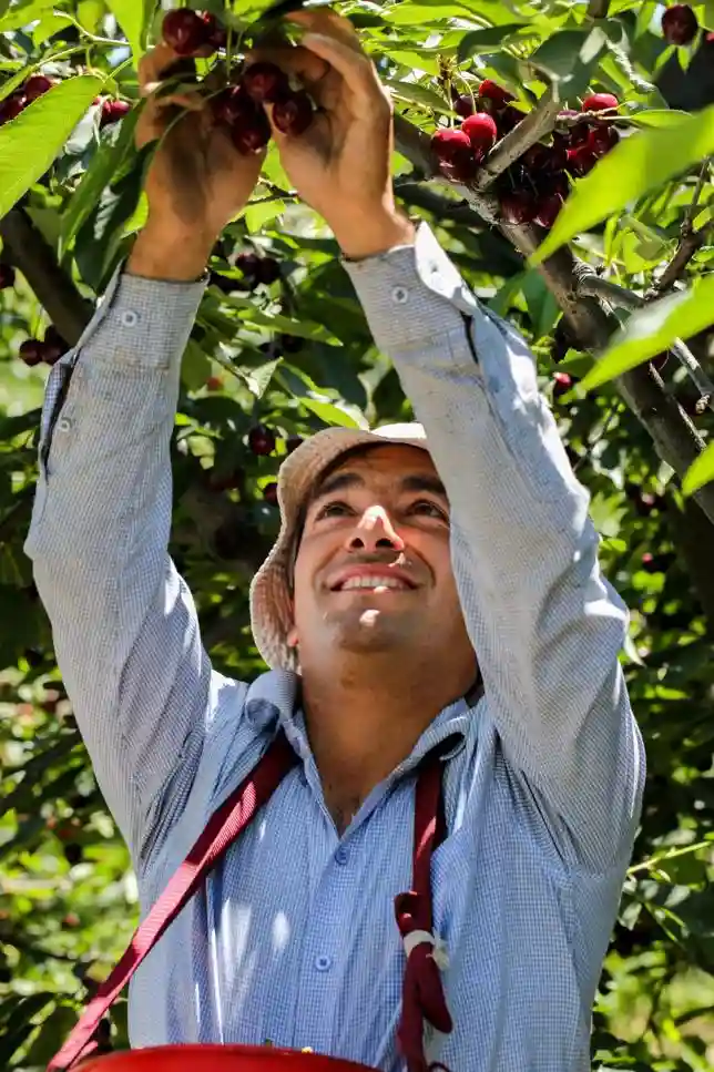 △智利采摘工人正在果园采摘新鲜的车厘子。