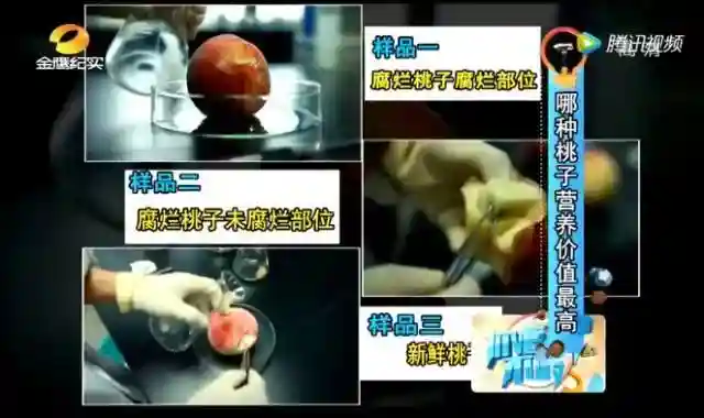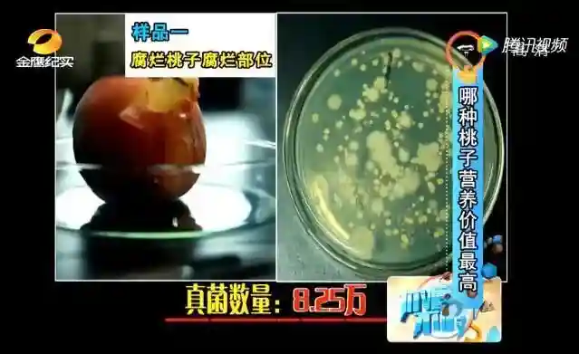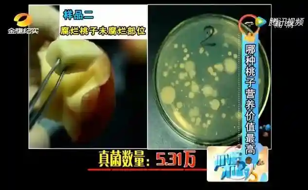 节目组找了一个腐烂桃子和一个新鲜桃子,分别取样,检测真菌数量。