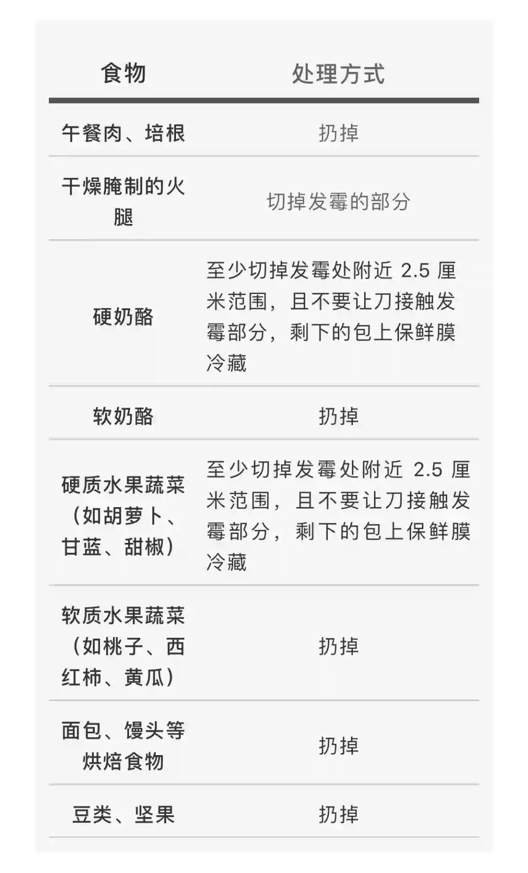 常见的食物及处理方式,都在这张表里了: