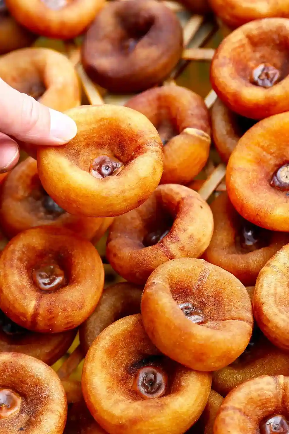 将一个个圆圆的月柿剥了皮,依次码放在木架上,尽情的享受着阳光浴,等它们逐渐变得柔软,颜色也由橙黄变成金黄色后,就到了考验手上功夫的时候了。师傅们要用恰到好处的力道按出一轮满月,就成了名符其实的“月柿”柿饼。