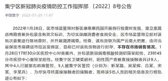 1月28日17时30分区疾控中心对香蕉内、外包装新冠病毒核酸检测初筛呈阳性,23时45分市疾控中心复检呈阳性。