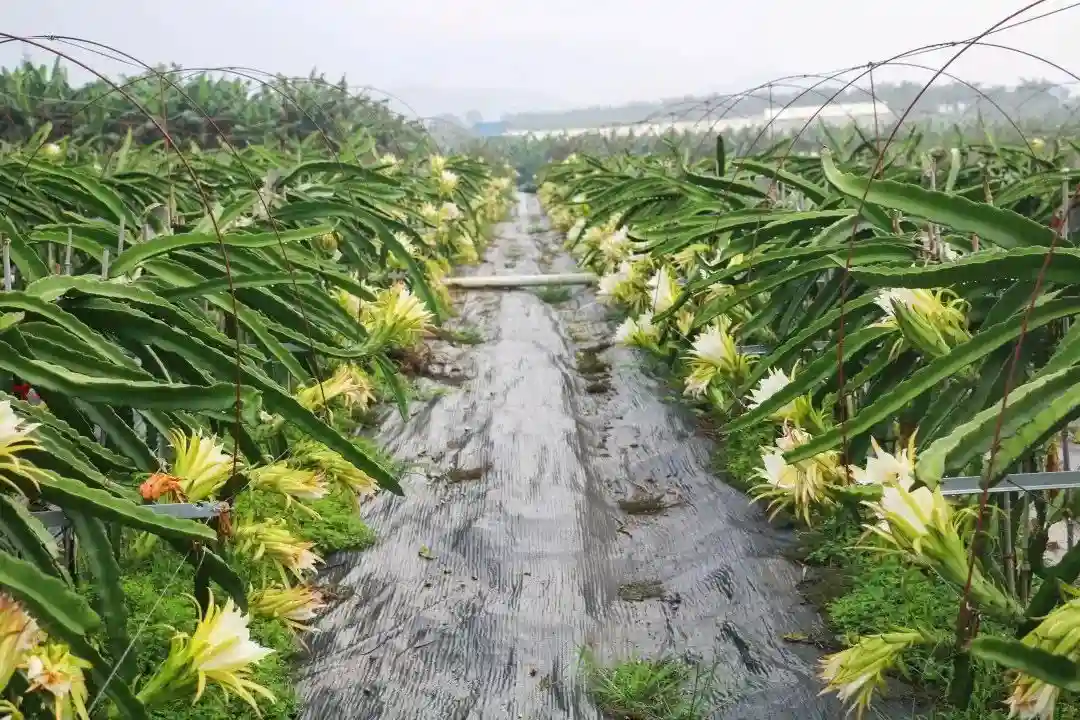 白天的隆安,一排排果树整齐地架在支架上,成熟的紫红色火龙果一个个色泽鲜艳,果形饱满,令人垂涎欲滴。