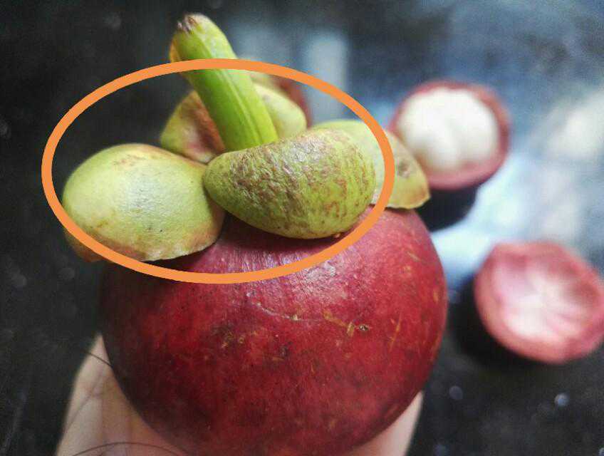 2、看山竹底部的萼片(下图圈起来的部分),也就是那个硬结,看起来像花瓣一样,有几瓣萼片就有几瓣果肉,一般是4~8片,所以我们就要选瓣数多的,通常有7、8瓣果肉的,里面的核也很少。