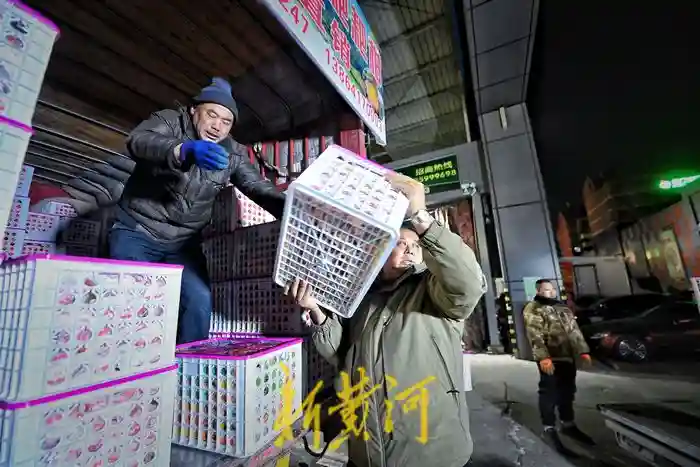 “像草莓、砂糖橘之类的应季水果,都是目前需求旺盛的产品,社区水果店的销售量也比较高。”王宏志有自己的车队,两辆厢式货车每天凌晨来堤口路进货。经过一个多小时的采购,王宏志的货车里装满了大约两吨果蔬产品。尽管室外气温已是零下6摄氏度,王宏志的额头还是渗出了汗珠。