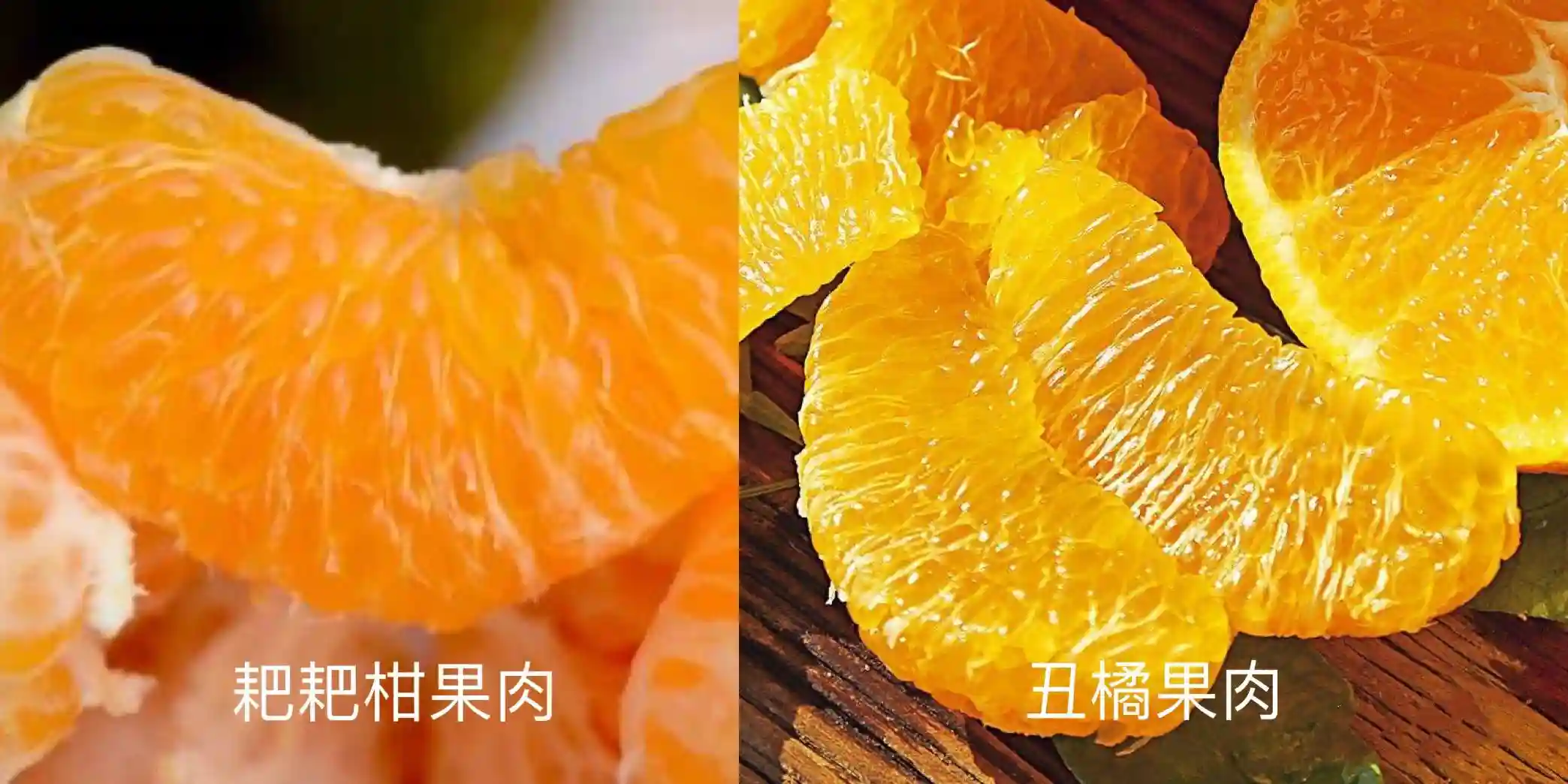 粑粑柑入口软糯多汁、甜大于酸,尤其是成熟的粑粑柑味道纯甜;而丑橘果肉偏脆、酸味大过甜味。此外粑粑柑个头普遍较小、水分大,轻轻一咬就有爆汁的口感。
