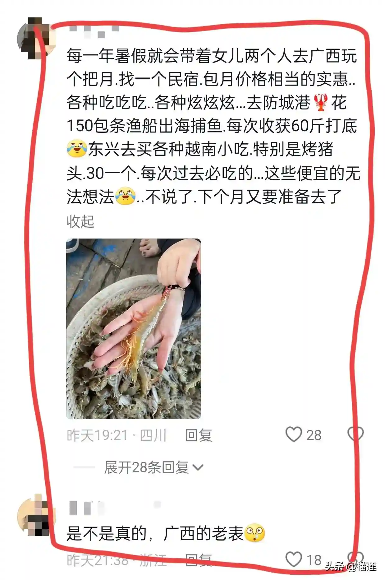 还有网友表示:每一年暑假就会带着女儿两个人去广西玩个把月.找一个民宿.包月价格相当的实惠..各种吃吃吃..各种炫炫炫…去防城港虾花150包条渔船出海捕鱼.每次收获60斤打底[泪奔]东兴去买各种越南小吃.特别是烤猪头.30一个.每次过去必吃的…这些便宜的无法想法[泪奔]..不说了.下个月又要准备去了