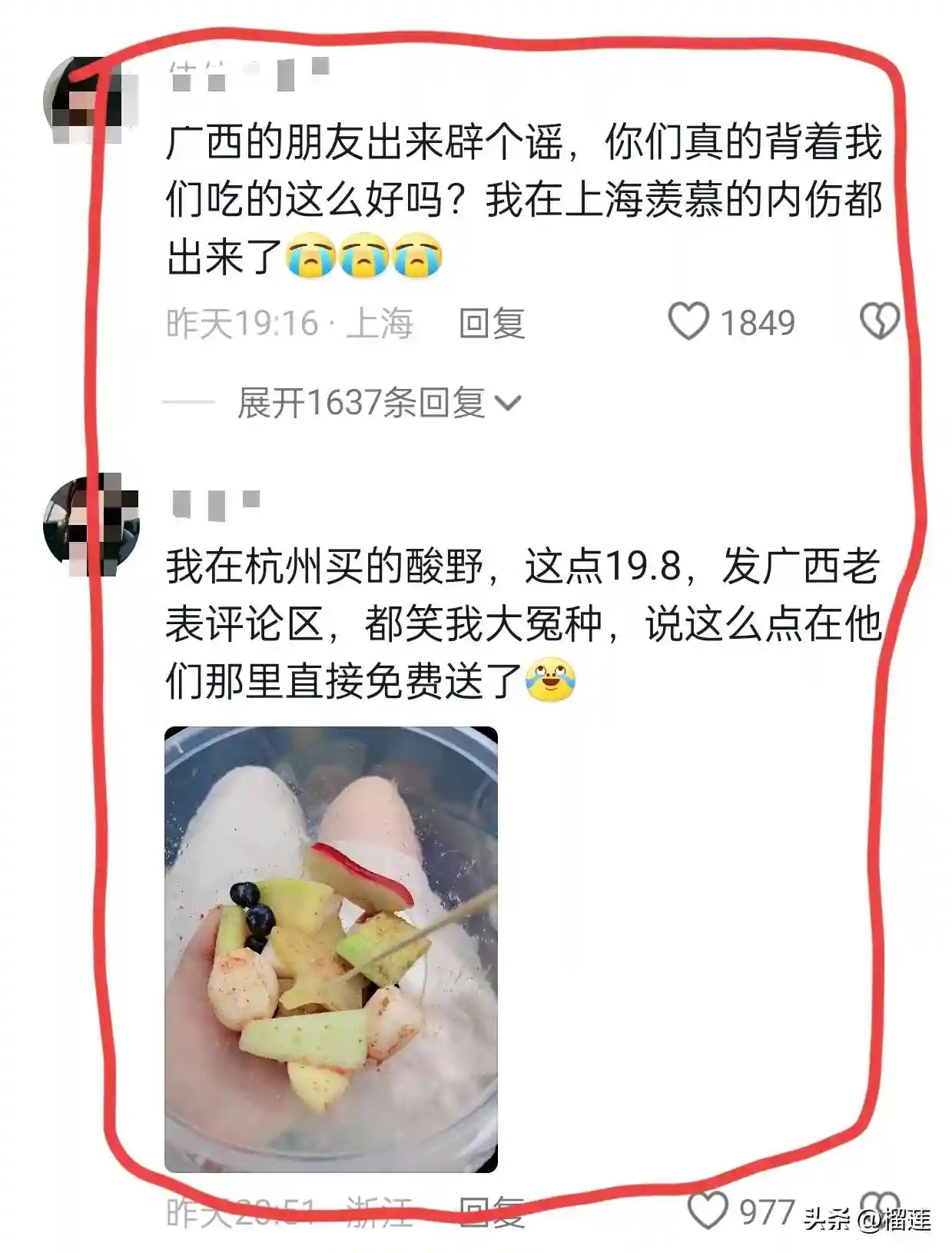 有网友表示:广西的朋友出来辟个谣,你们真的背着我们吃的这么好吗?我在上海羡慕的内伤都出来了[捂脸][捂脸]