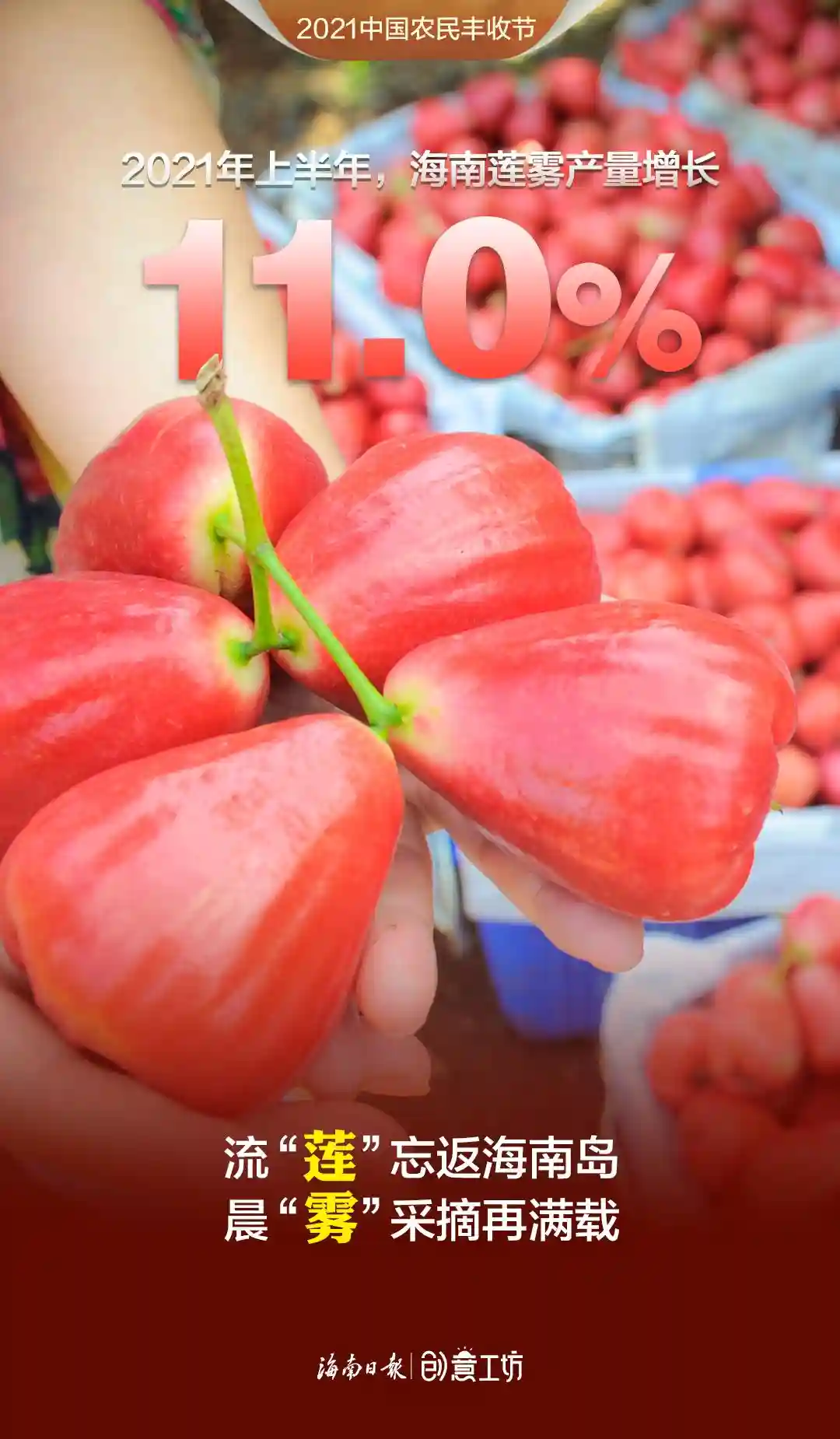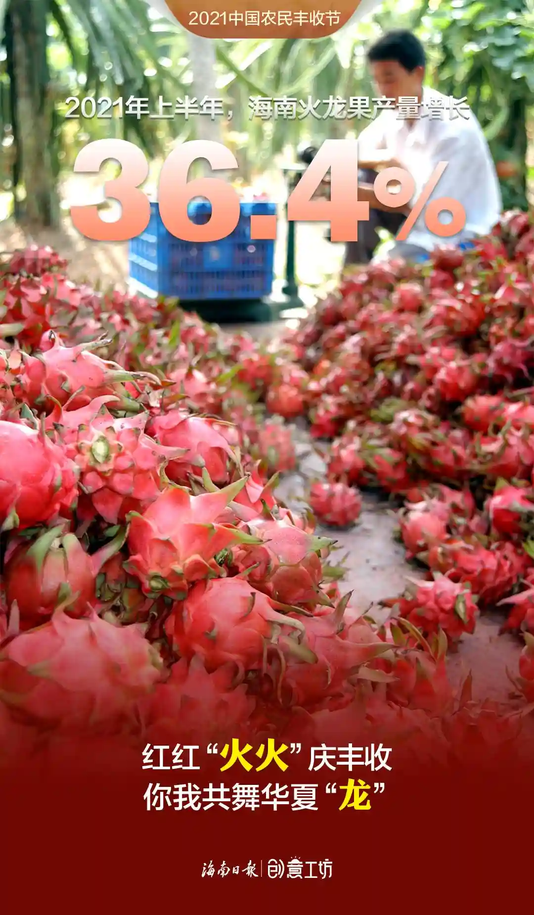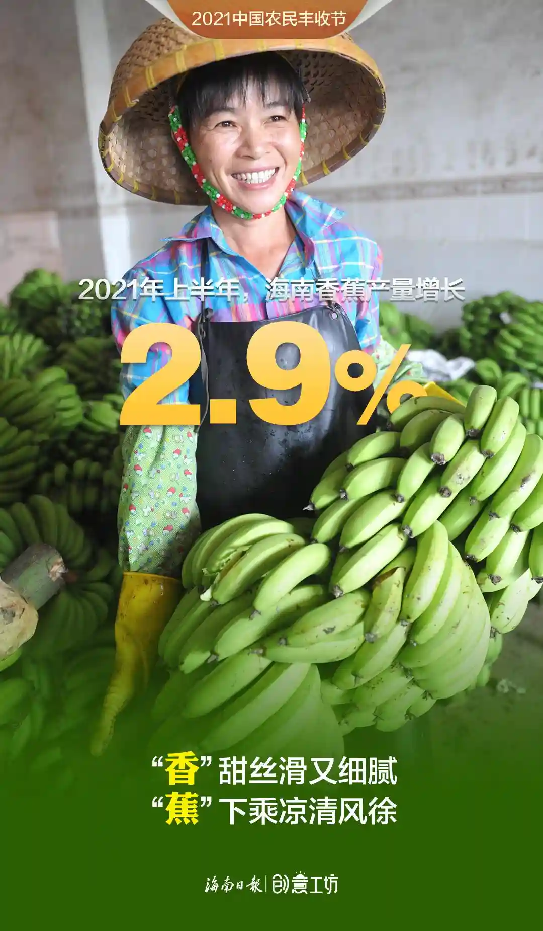 2021年上半年,海南蔬菜、水果再获丰收,蔬菜产量419.55万吨,水果总产量386.22万吨,相比2020年上半年分别增长4.8%、6.9%,哈密瓜、火龙果、莲雾、百香果等优势水果步入收获期,有力助推种植业增长。在第四个中国农民丰收节来临之际,伴随着海南田间地头丰收的喜悦,新媒体中心制作了一组令人“垂涎”的创意海报《水果话丰收》,这些有颜有料的水果个个自信满满、魅力无限,快看看“她们”有什么话要对你说!