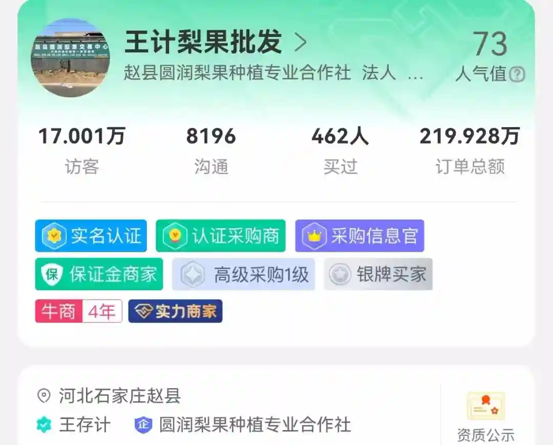 如今,王存计的店铺访客已经达到17万,线上销售额已经超过了200万,年销售梨子总量在400万斤左右,比之前增长很多。“幸好是赶上了前几年的线上销售农产品的风潮,我开始的早,店铺累计的客户就越来越多,现在生意上70%都是以前积累的老客户来购买的”。王存计表示,现在农产品行业竞争太激烈了,要想让农产品不愁销路,除了本身的品质之外,打通链接市场的销售渠道也是非常重要的。