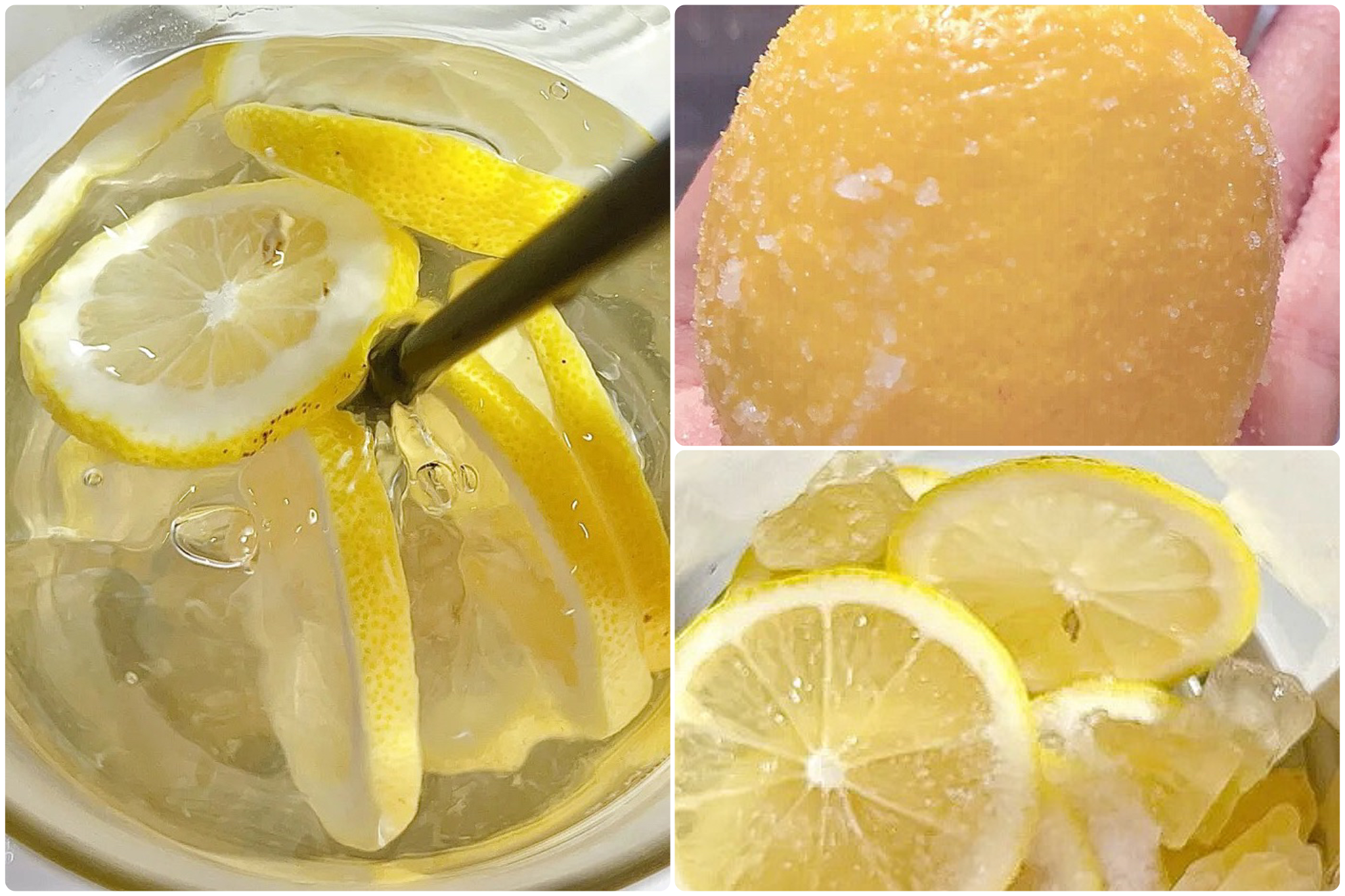 ②将柠檬片、食盐和冰糖一起放入杯子中;