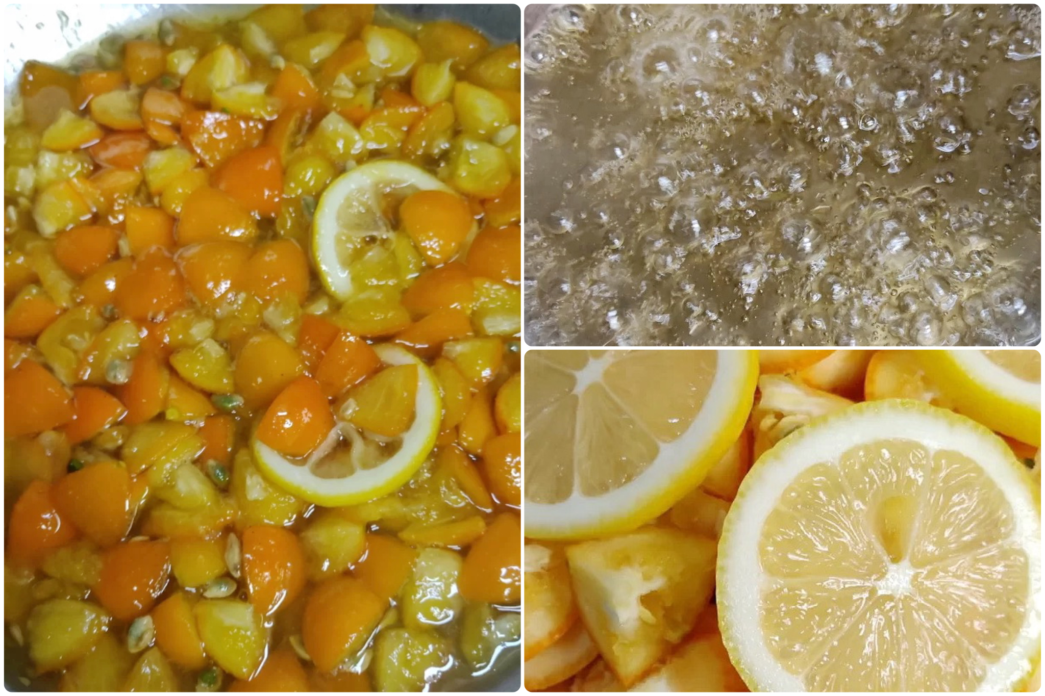 ③放入金桔和柠檬,熬到变浓稠即可,喝的时候,舀上1勺泡温水喝,剩余的放冰箱冷藏保存。
