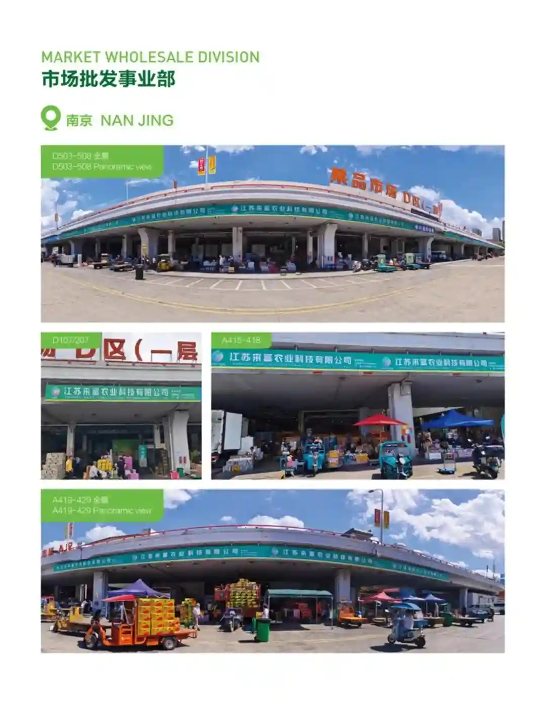 公司在南京坐拥1000多平方米的办公中心以及4000余平方米的物流中心。在南京众彩水果批发市场拥有40多个车位,车位数量在南京位列第一。在嘉兴海广兴水果市场设有3个批发档口。