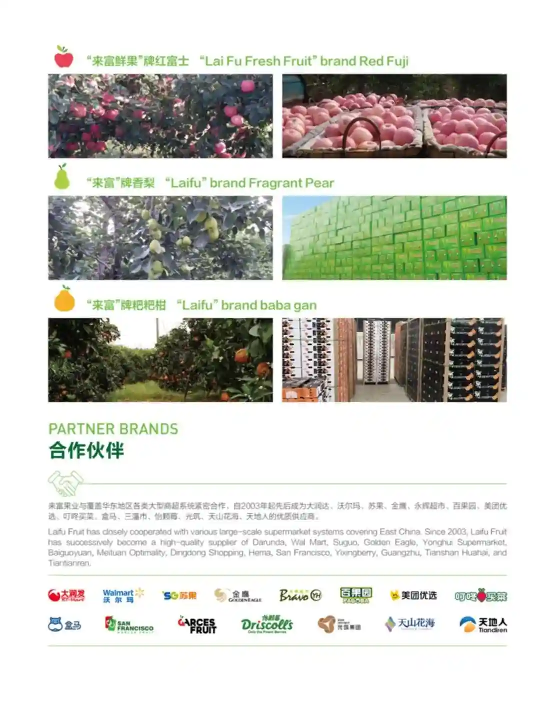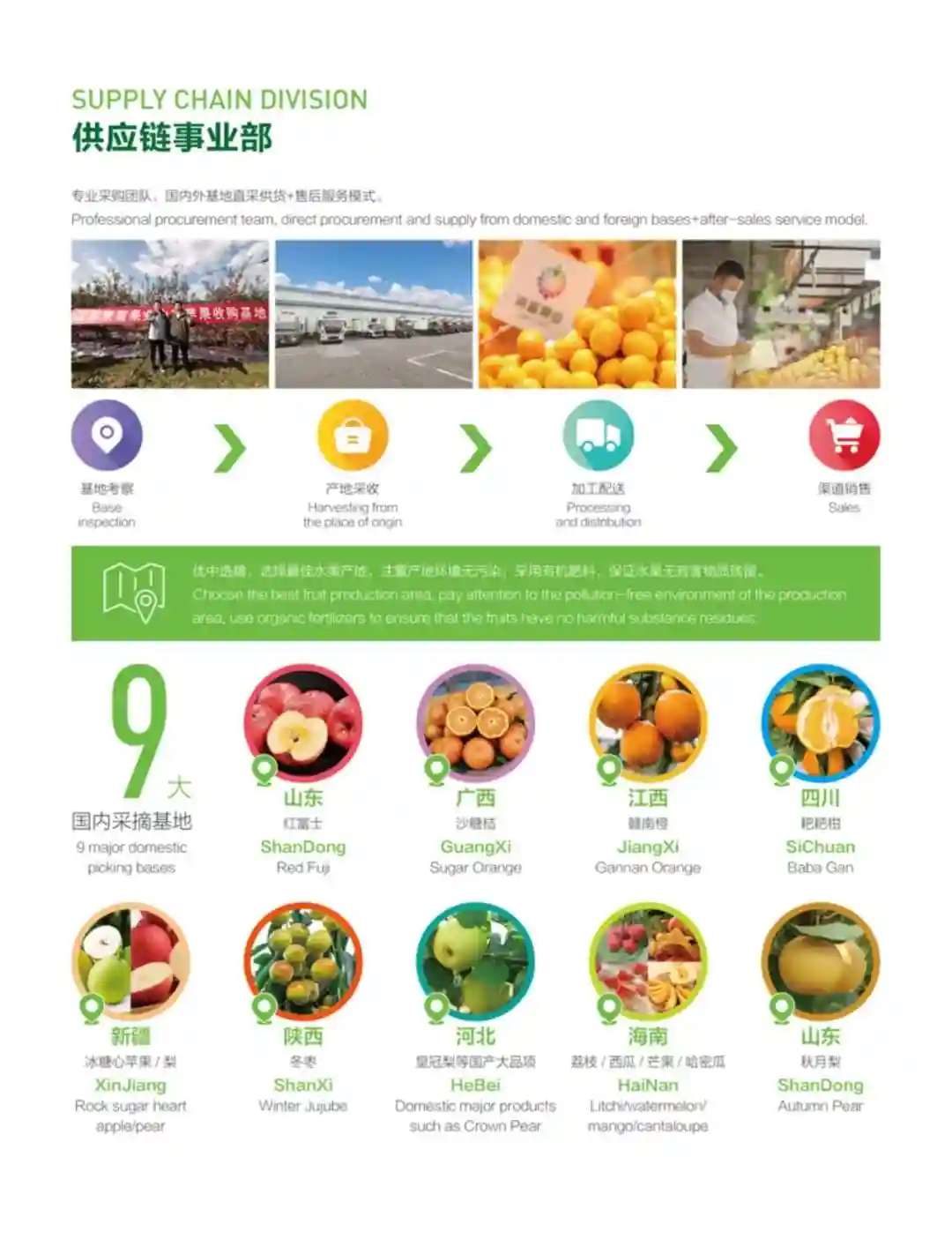 公司在海内外与当地优势资源种植基地通力合作,多年来持续与时俱进、开拓创新,不断优化产品结构,达成了全产业链的无缝链接。成功打通全域采销链路,构建起多渠道分销体系,成为大润发、沃尔玛、华润苏果、永辉、盒马、金鹰、百果园等商超和电商渠道的优质供应商。