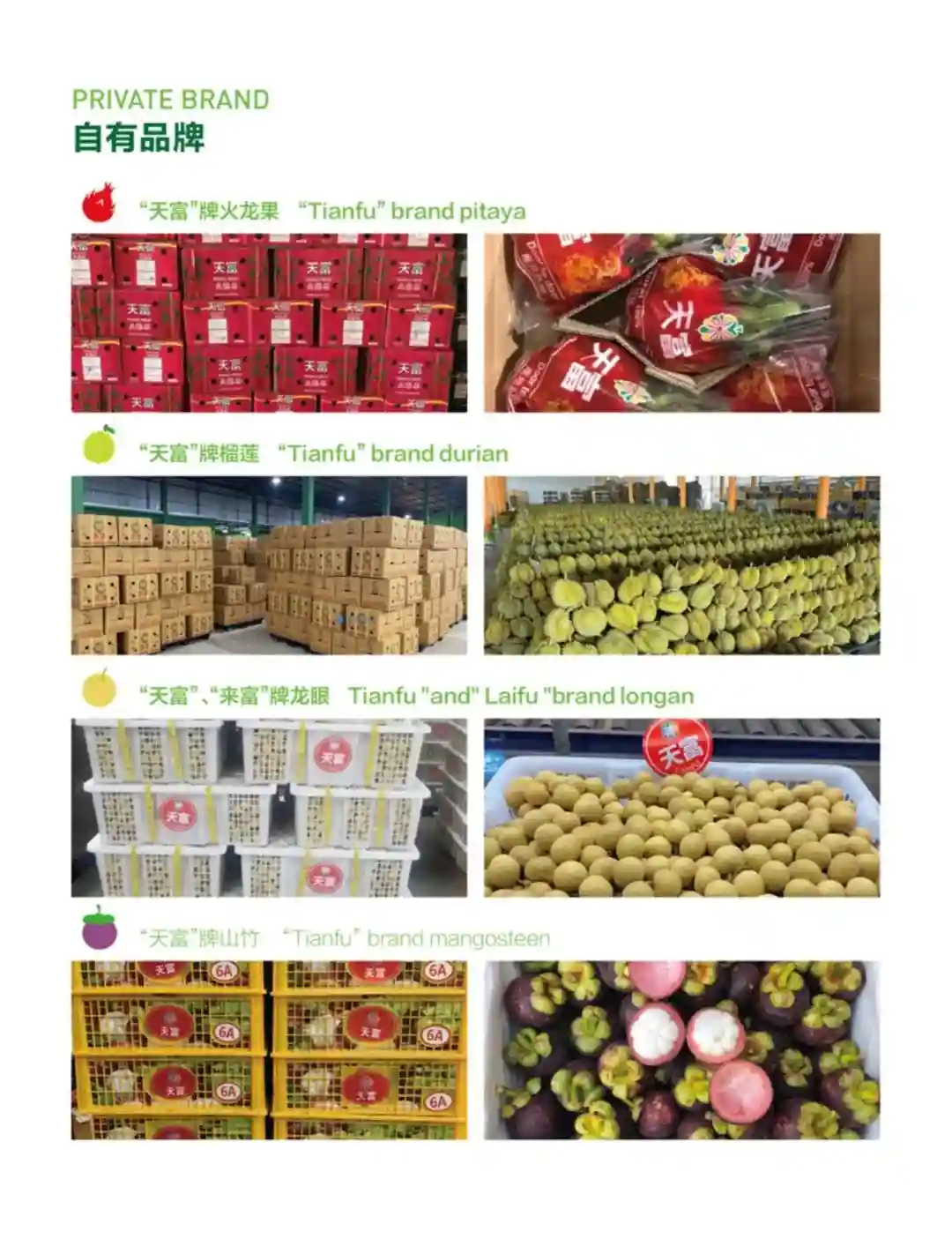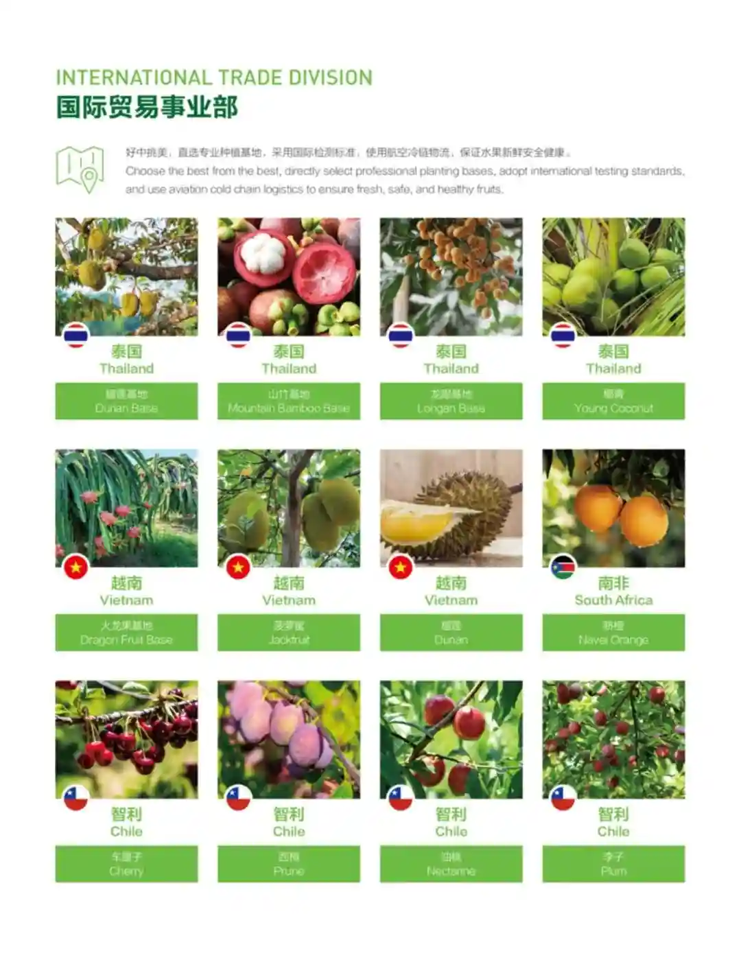 在泰国、越南等地拥有多家工厂基地,主要开展榴莲、龙眼、山竹、椰青、火龙果、菠萝蜜等进口水果的国际贸易,进行产地采购加工,原柜进口直发嘉兴、广州、南京、无锡、郑州等市场。