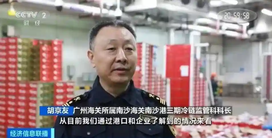 广州海关所属南沙海关南沙港三期冷链监管科科长胡京友:从目前我们通过港口和企业了解到的情况来看,预计2024年春节之前,南沙港区共将接卸9艘(次)智利车厘子快船,总计约有8万吨车厘子进口。