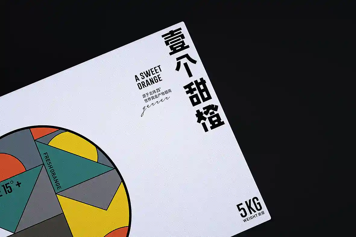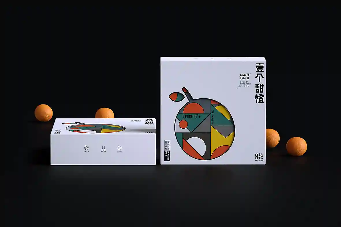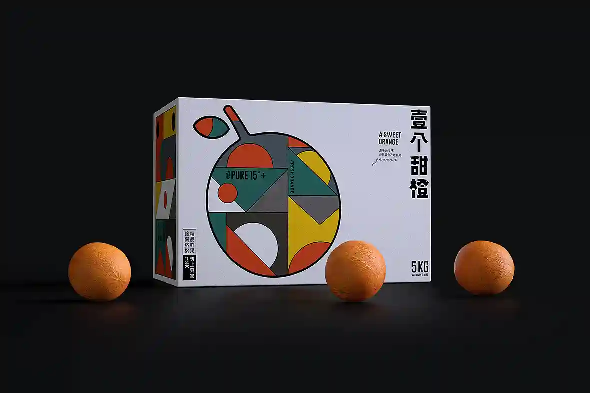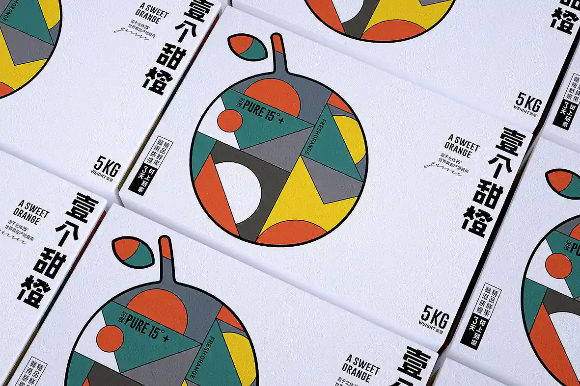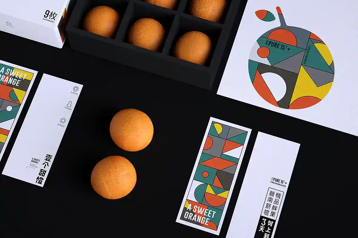 呼应名称以“壹个甜橙”创意主视觉图形,由几何图形组合而成,时尚新颖,相比于一般传统水果品牌更有识别性和差异感。