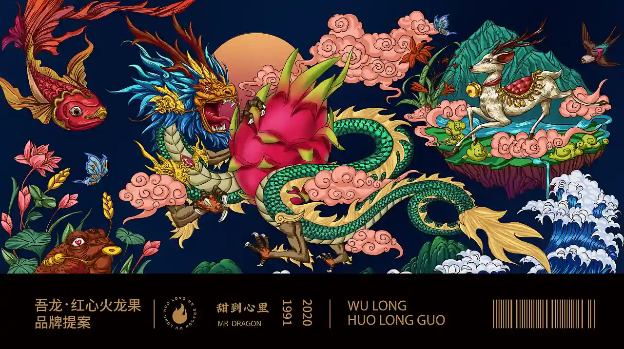 并将“中国龙”与火龙果融合成创意插画,一幅祥龙戏珠的画面传递美好祝愿,同时具有强大的视觉冲击力。
