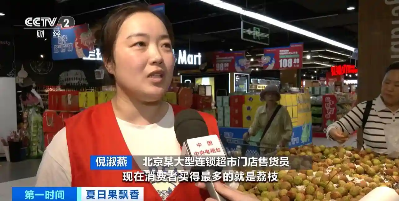 北京某大型连锁超市门店售货员倪淑燕:现在消费者买得最多的是荔枝,价格比刚上市的时候便宜多了,半个月前每斤19.98元,现在每斤9.98元。