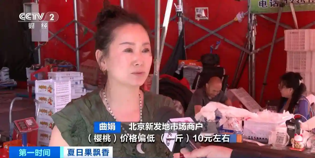 北京新发地市场商户曲娟:樱桃价格偏低,每斤约10元,每天卖三四千斤。