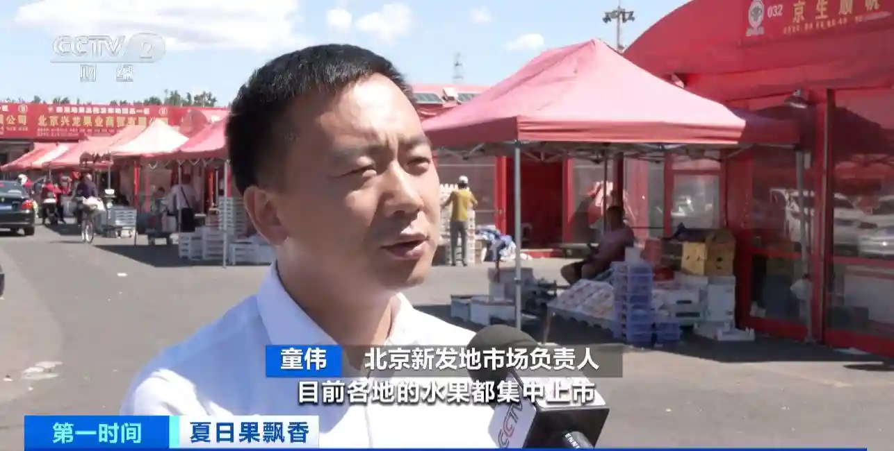 北京新发地市场负责人童伟:目前各地的水果集中上市,产量较大,新发地市场每天水果上市量约1.3万吨,其中西瓜上市量最大,新发地市场每天达2000多吨。麒麟西瓜刚上市每斤约6元,现在调整到每斤约3元。