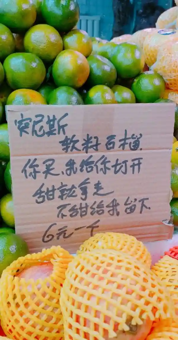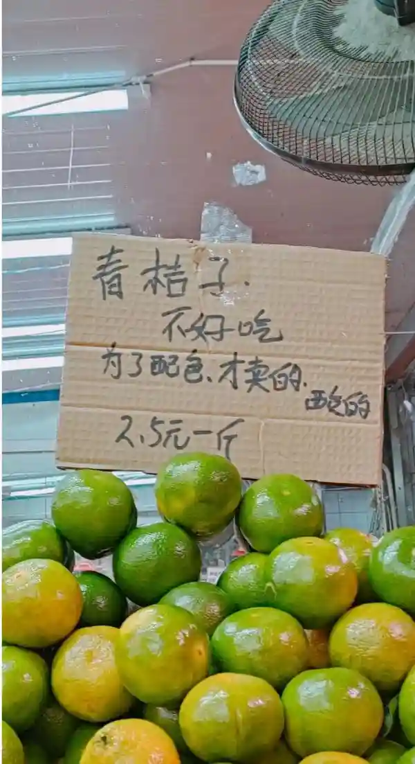 对于“青桔子不好吃,为了配色才卖的,酸的”的标语,他表示青桔确实是酸的,“一些应季水果刚上货时不太好吃,写的都是大实话”。