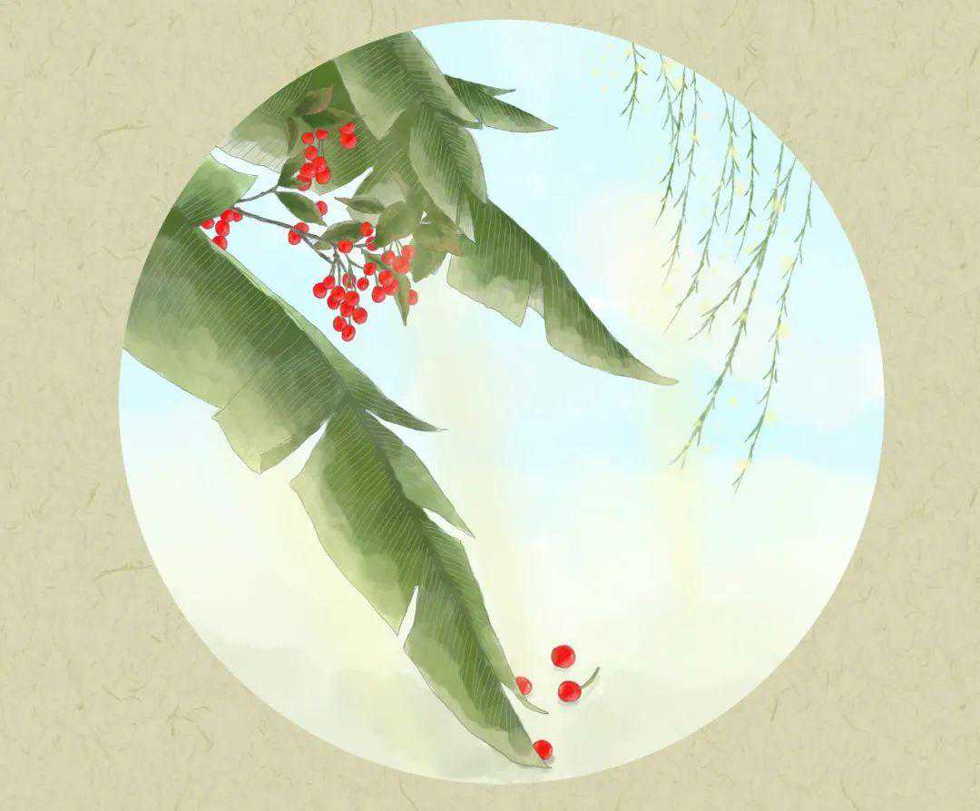 “斜日庭前风袅袅,碧油千片漏红珠。”这两句是说,夕阳西下,庭院前南风悠悠吹过樱桃树,绿得发亮的树叶间,露出了红宝石一般的樱桃。这是写“樱桃之结果”。