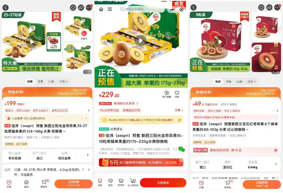 其中,佳沛阳光金奇异果特大果25-27粒装原箱(单果重124g-146g)预售到手价为199元,佳沛阳光金奇异果超大果16-18粒原箱(单果重175g-233g)预售到手价为229元。此外,佳沛红宝石奇异果8粒装到手价为49.9元。