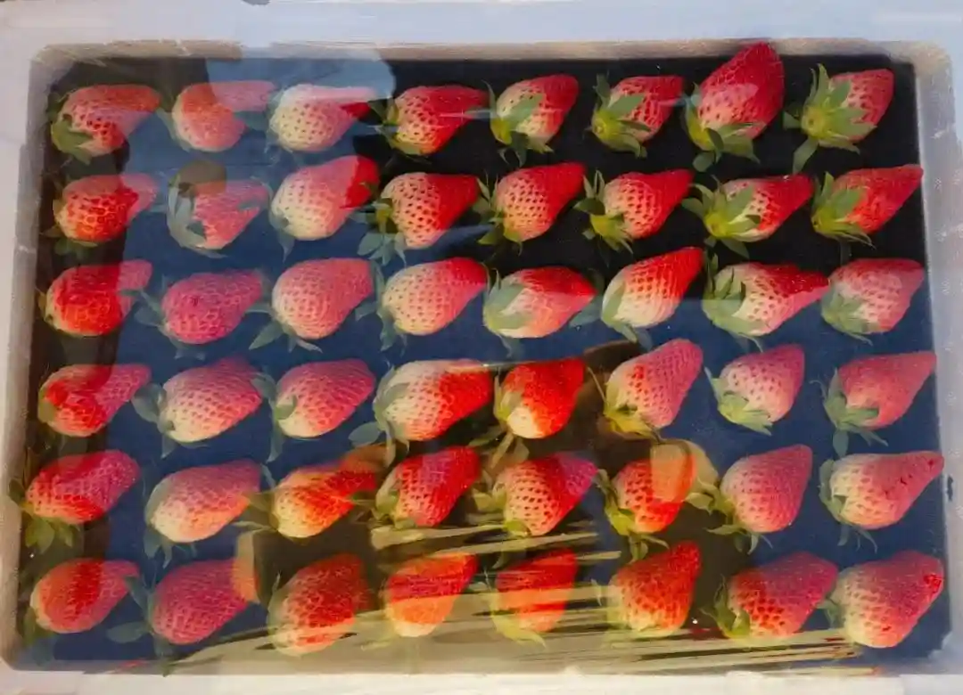 这些草莓有的以盆的形式展示,供顾客随意挑选;有的则被摊主精心包装在华丽的盒子里,精致诱人,等待着有缘人的青睐。