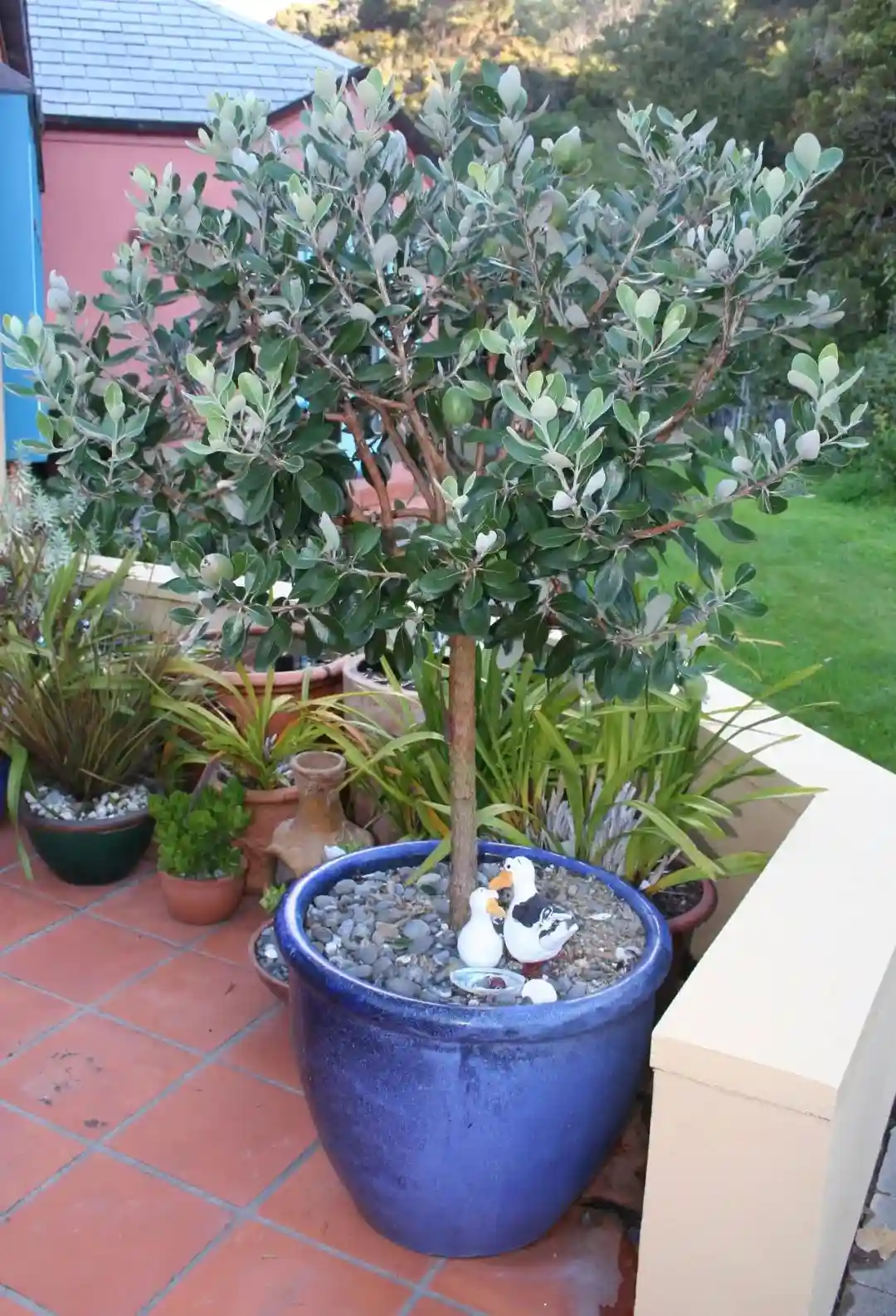 菲油果的叶子看起来比较圆润,和桃金娘、尤加利叶有点相似,都是银白色的,果实也可以用来吃,观赏性和实用性都非常好。