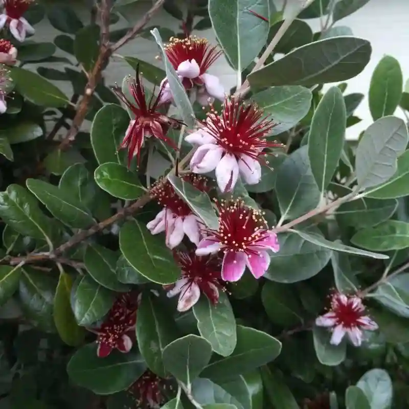 菲油果是桃金娘科的一种灌木花卉,也被称作菠萝番石榴,是多年生的一种小乔木,在春夏季节就开花,在秋季的时候孕育果实,在冬天特别寒冷的地方,就要搬到室内保暖。