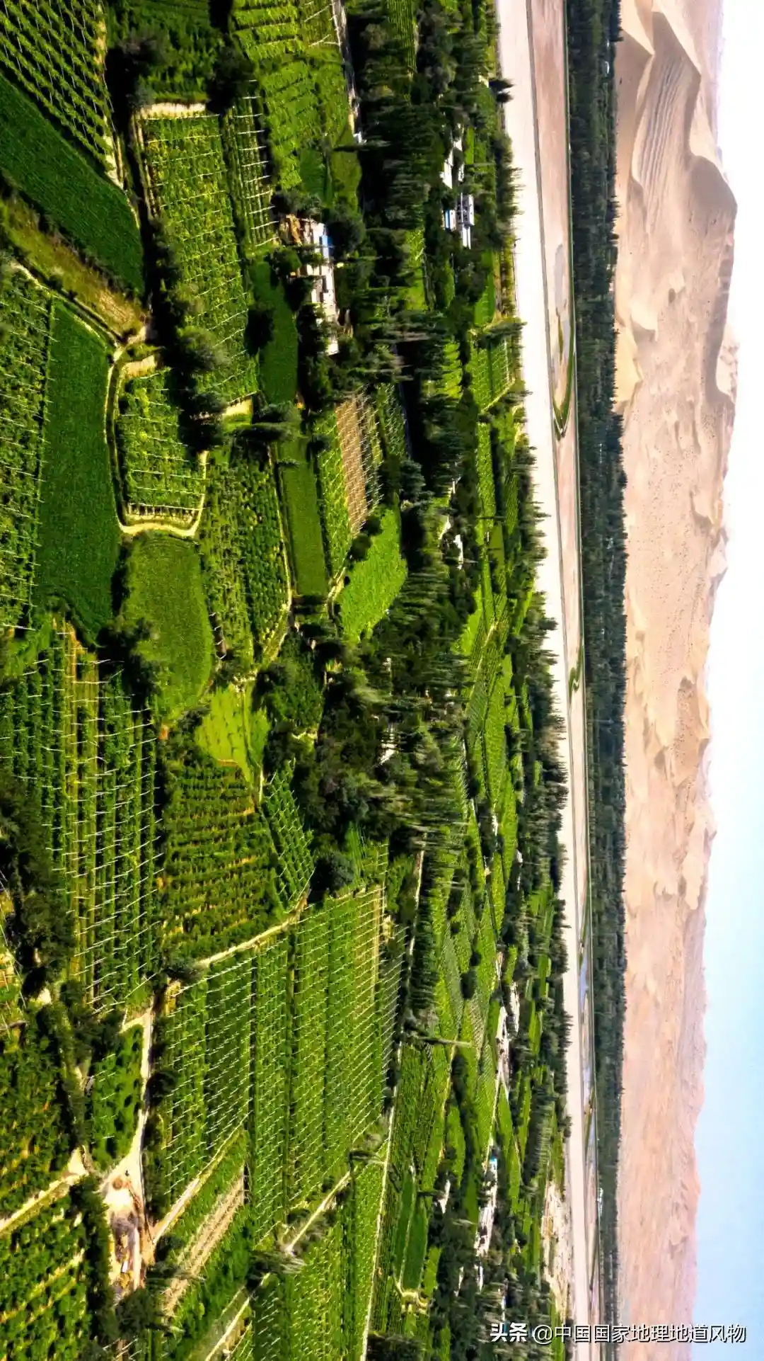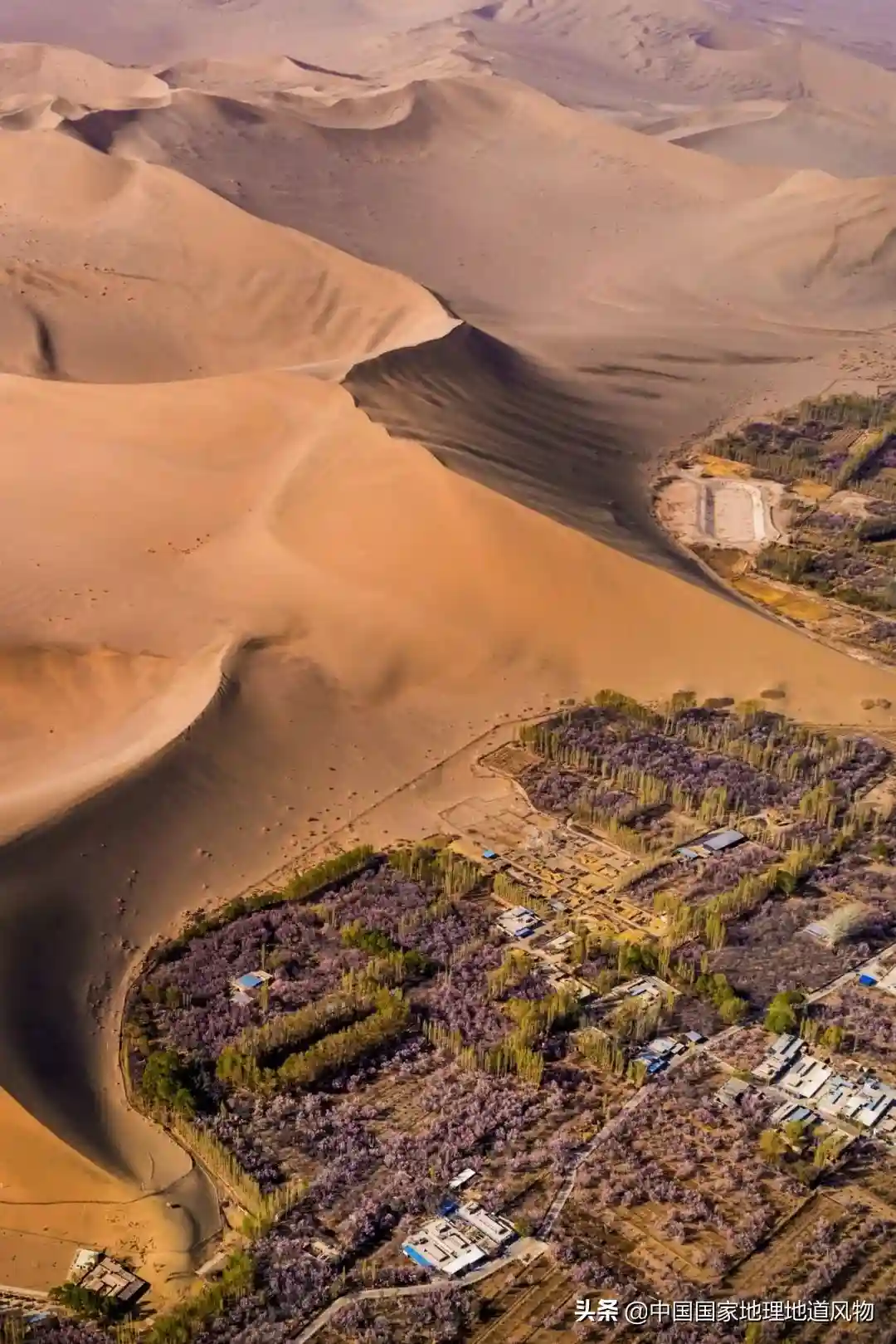 敦煌鸣沙山下,杏树延伸出一片绿洲。