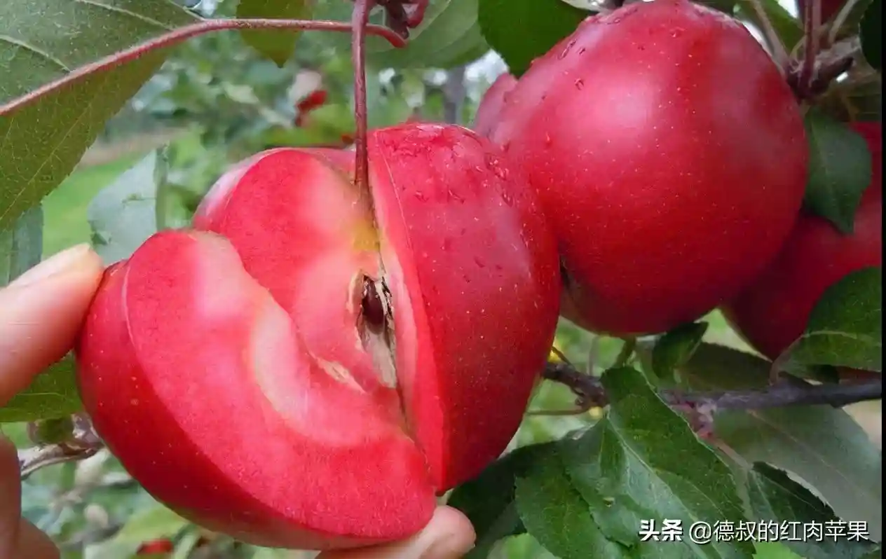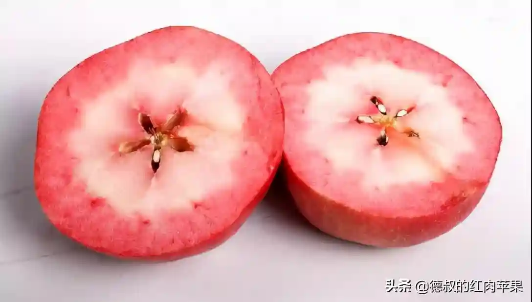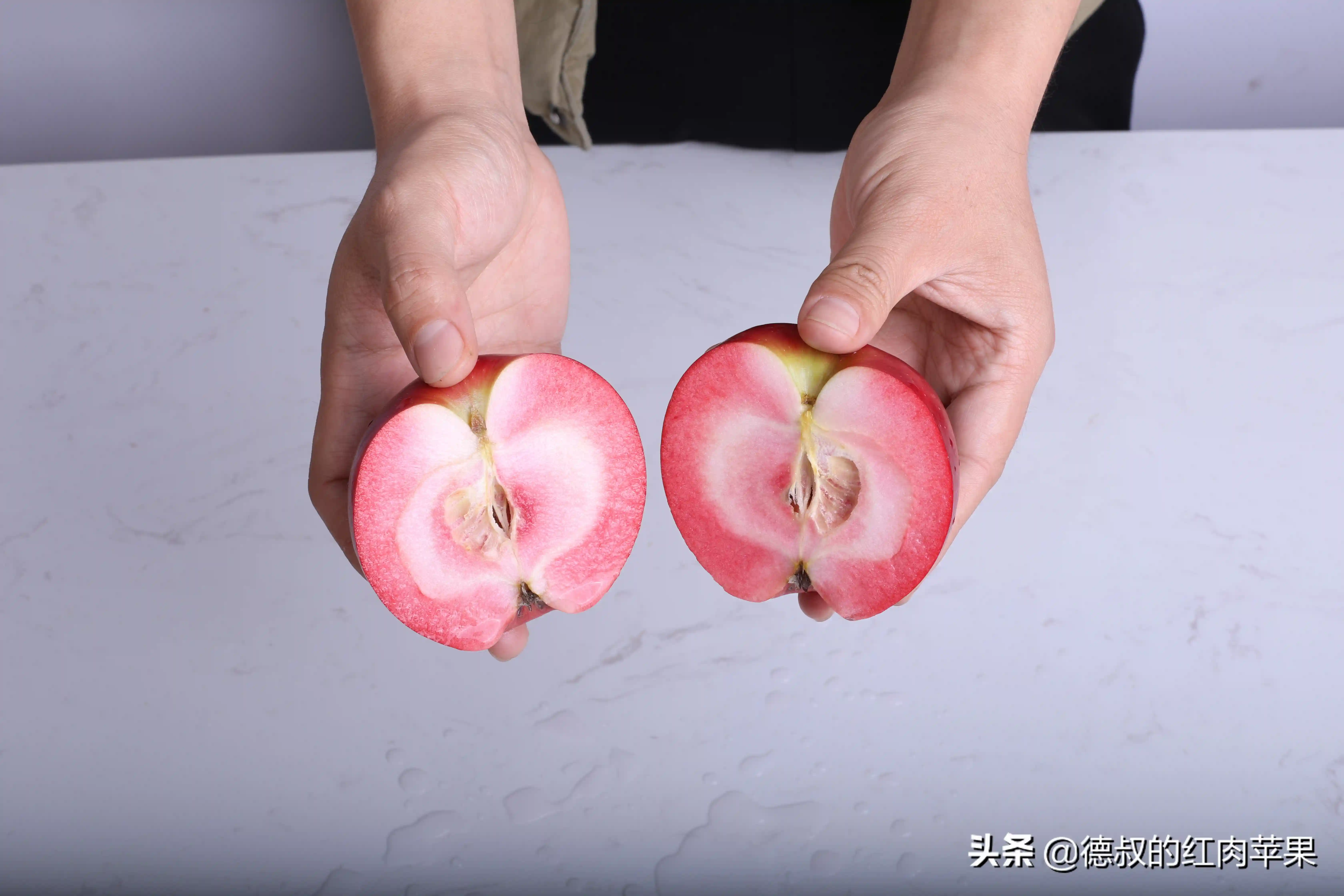 除了高颜值之外,她的营养含量也是非常高的,普通苹果的只有在自身红色的部分才含有一定量的花青素,而这款幸运果从里到外,都含有非常丰富的花青素,相对于普通的富士苹果来说,高出了23倍,在果实成熟之际可溶糖会增多,细胞为酸性,而花青素在这种条件之下就会呈现红色。