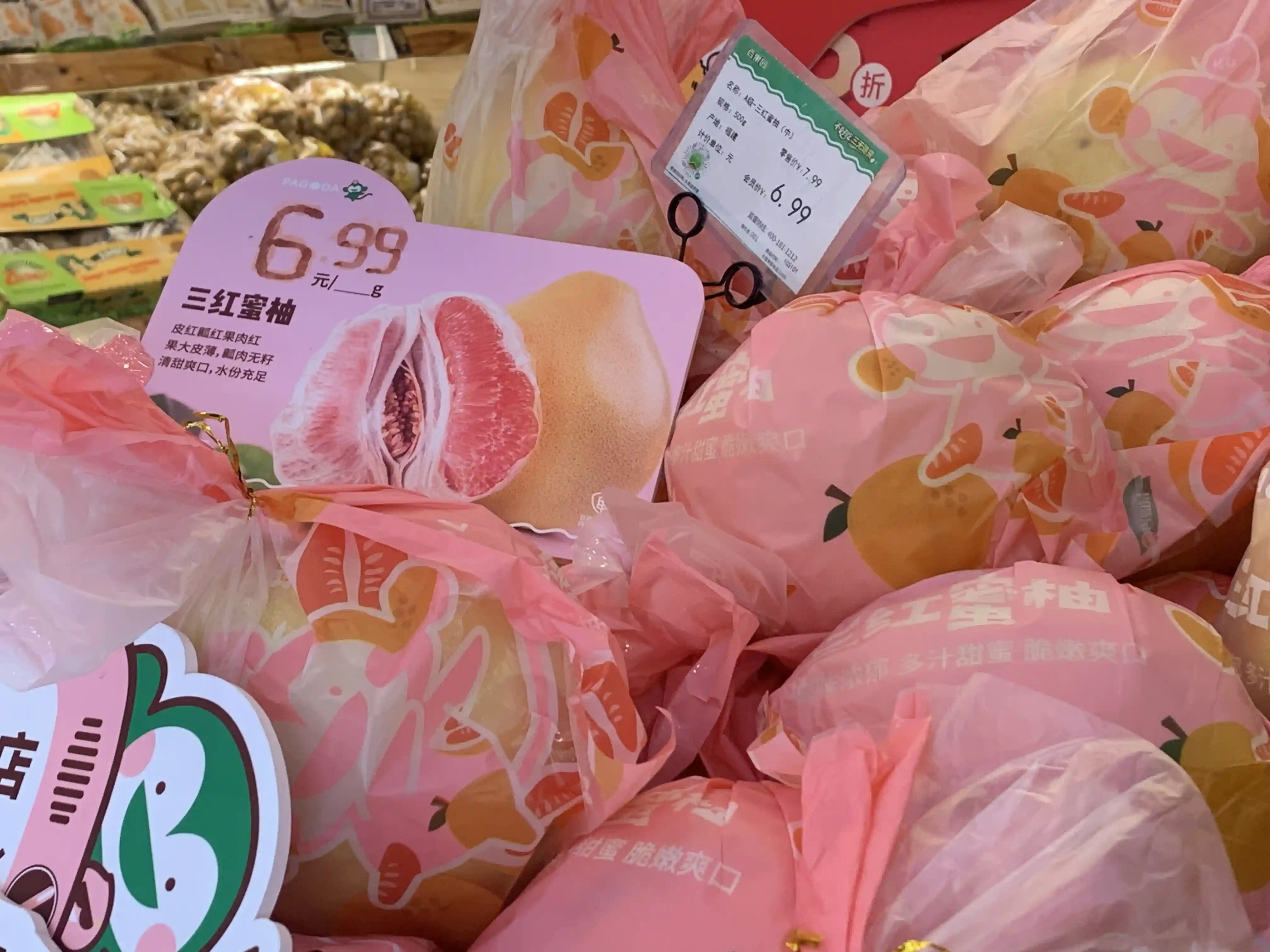 在位于武定路的水果卖场里,一位女士一下子购买了三只“三红蜜柚”。工作人员介绍说,现在柚子大量上市,店里一共上架了三种不同的柚子,其中价格最低的是普通蜜柚,每斤售价不到3元。而“皮红、瓤红、果肉红”的“三红蜜柚”属于店里近期的主打产品,正在开展优惠活动,它的售价为7.99元/斤,会员价为6.99元/斤,恰逢周二活动日,在该店的微信小程序上注册成为会员的顾客,还可享受8.8折优惠。
