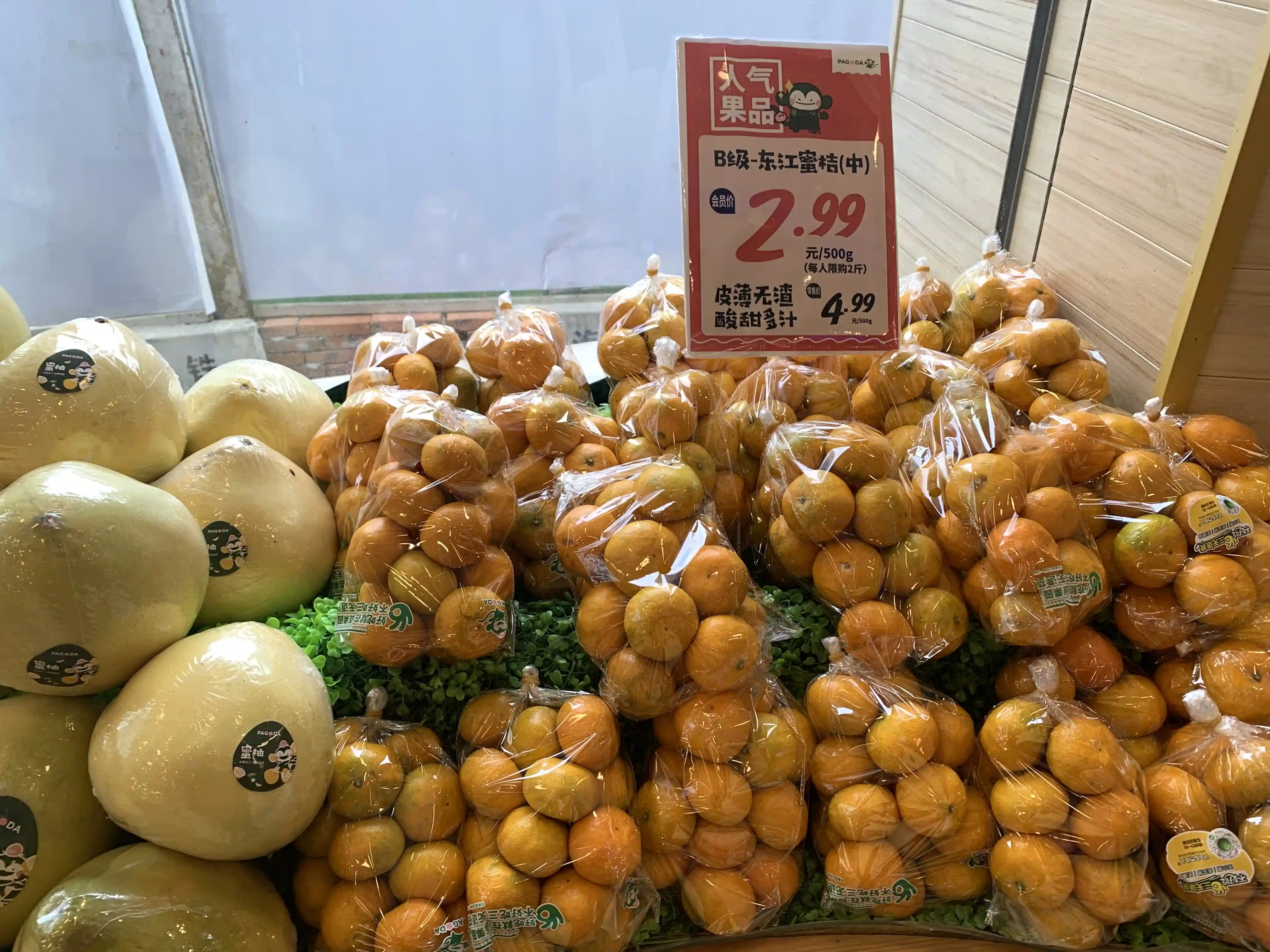 店里同样促销的还有来自湖南的东江蜜桔,零售价4.99元/斤,会员价2.99元/斤。