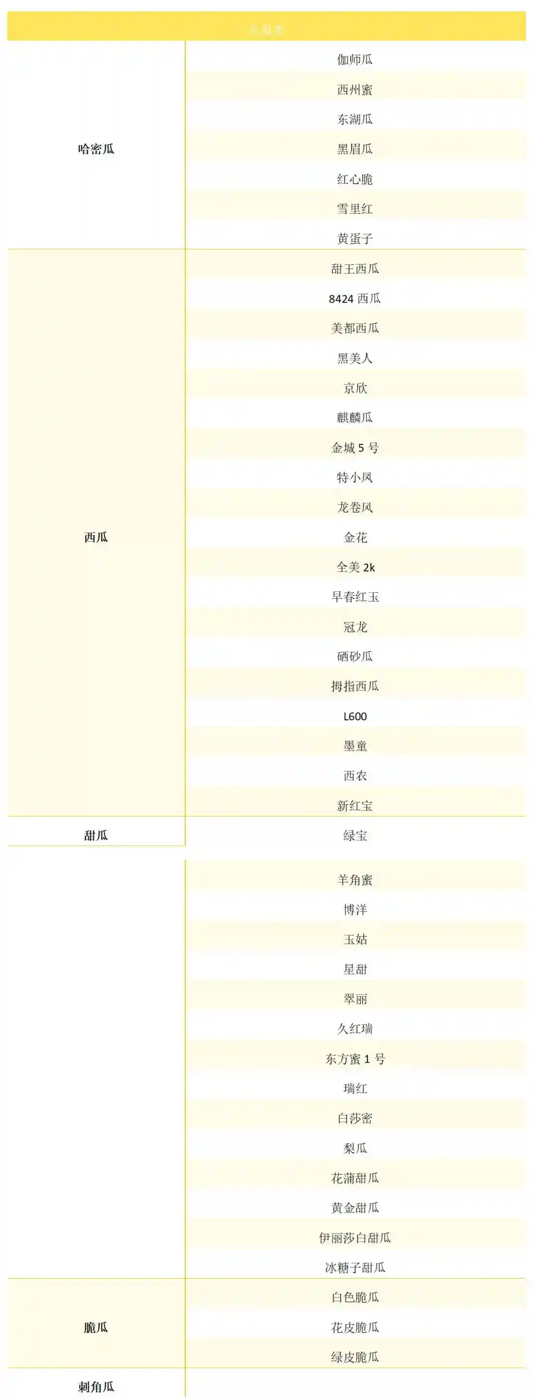 瓜果类水果的主要特点在于:果皮在老熟时会形成坚硬的外壳表皮,常见的瓜果类水果有:各种哈密瓜、西瓜、甜瓜、脆瓜、刺角瓜等。