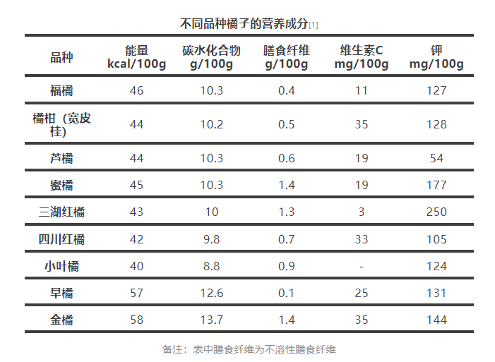 《中国食物成分表》中列出了多种橘子的营养成分,虽然不同品种之间会有差异,但并不是很大。