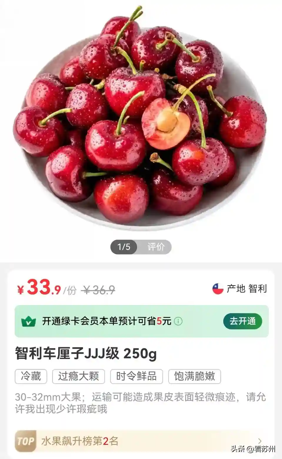 在某生鲜平台上,记者看到250克3J级车厘子售价为33.9元,已上榜“水果飙升榜第2名”。