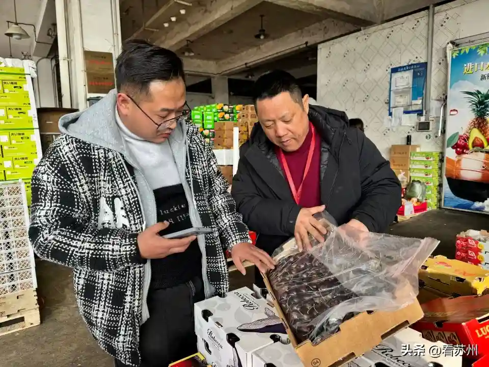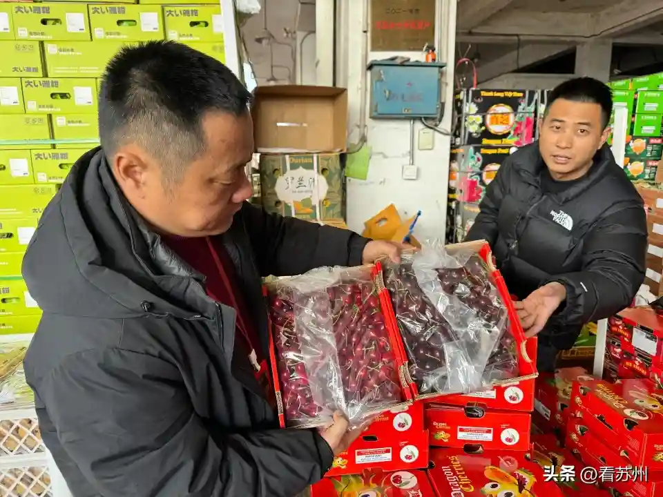 “40元一斤,走过的带两斤!”“178元5斤礼盒装超划算,自己吃送人都方便!”苏州新民桥菜场二楼的水果摊位上,张老板正在吆喝,大力推销智利进口车厘子。