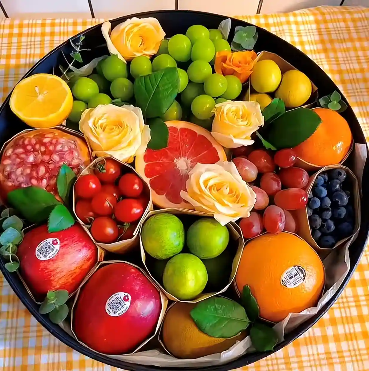 水果搭配时需要有个主色系,同时点缀其他补色的水果,比如以红色系为主,配上苹果、莲雾、车厘子等水果,营造出温暖热烈、果实成熟的感觉,加少许绿色以作点缀、使果盒整体色彩保持平衡,且不至于太过单调。
