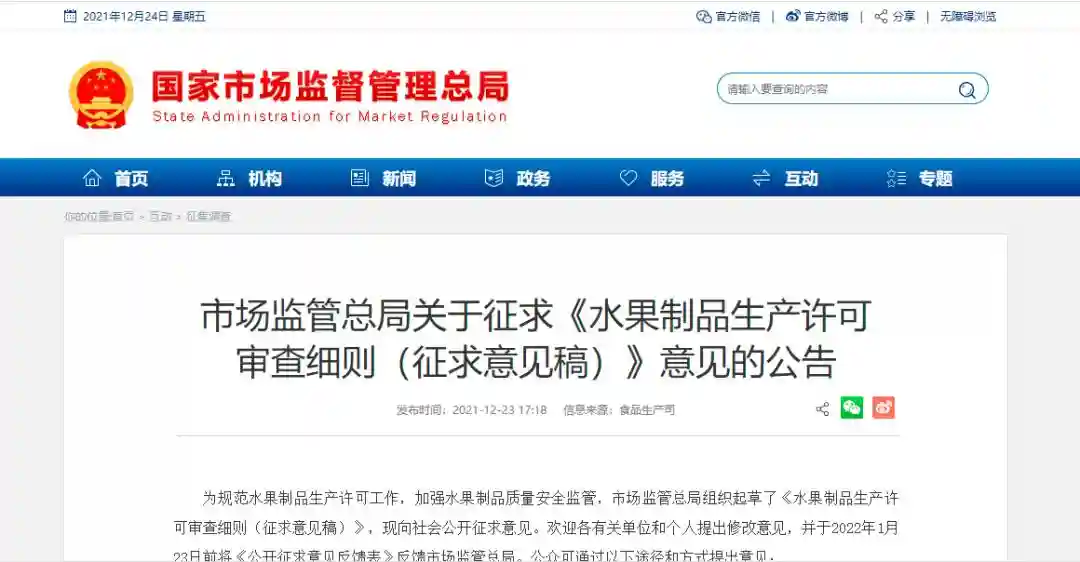 市场监管总局关于征求《水果制品生产许可审查细则(征求意见稿)》意见的公告