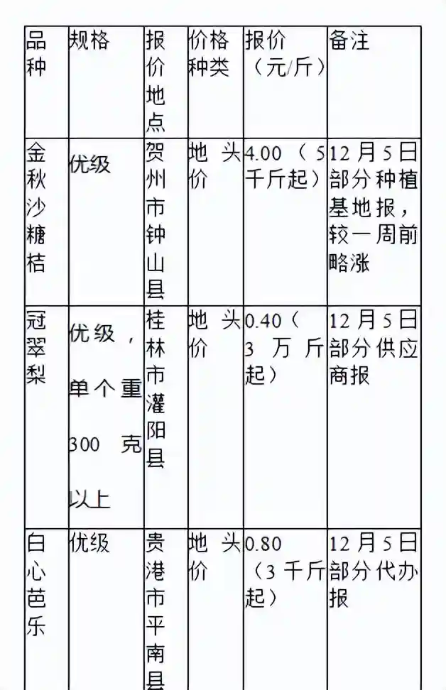 据广西新农人传媒市场监测显示,12月5日前后较一周前的11月28日前后而言,国内果市水果行情出现一些变化,一方面秋冬季水果上市品种和上市量继续增加,部分水果价格亲民,但包括今年的金秋砂糖橘在内的另外一些水果价格偏高,要等它们“价廉物美”还得多些时日才行。